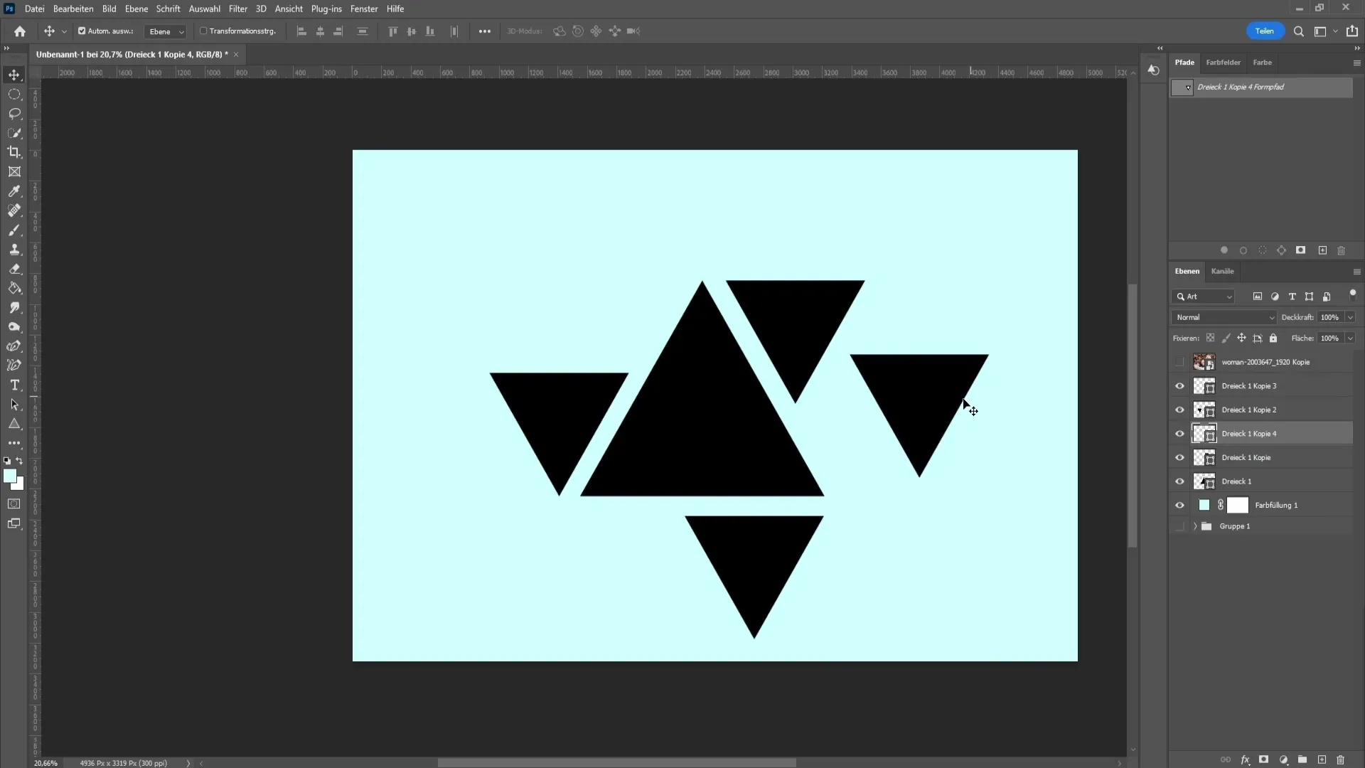 Con lo strumento Sposta puoi posizionare il triangolo nella posizione desiderata. Per creare un altro triangolo, tieni premuto il tasto Alt mentre copi il primo triangolo. Se desideri ruotare il secondo triangolo, premi Controllo e T, quindi tieni premuto il tasto Shift mentre ruoti il triangolo a intervalli di 15°.