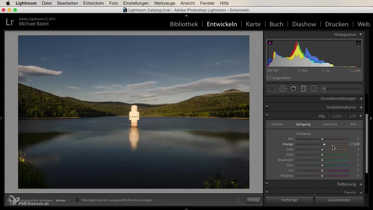 Ora arriviamo alla saturazione. Qui puoi aumentare o diminuire l'intensità dei colori. Sposta i cursori per l'arancione e il giallo verso l'alto e guarda come cambia l'immagine. Anche qui vale: non esagerare. Un'immagine può apparire rapidamente esagerata e innaturale se la saturazione è troppo alta.