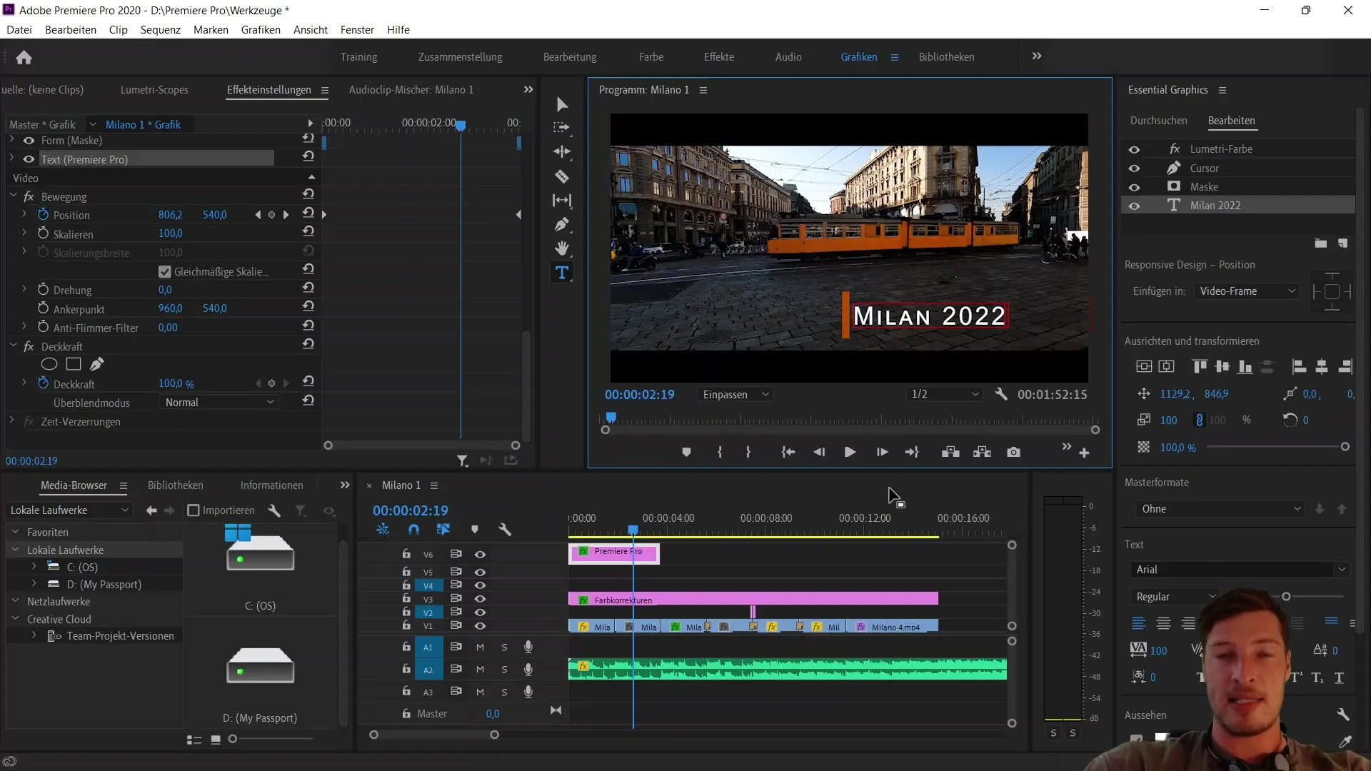 Sei ora pronto per iniziare l'esportazione della sequenza. In questo tutorial ci concentriamo sull'esportare uno screenshot di un singolo frame come file immagine. Abbiamo un impressionante sfondo con il tram a Milano e il logo "Milano 2022". Prenderemo questo frame come esempio.