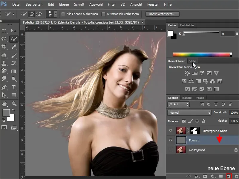 Nel nostro primo esempio, vogliamo ritagliare la donna dallo sfondo senza perdere i capelli sottili e fluttuanti.