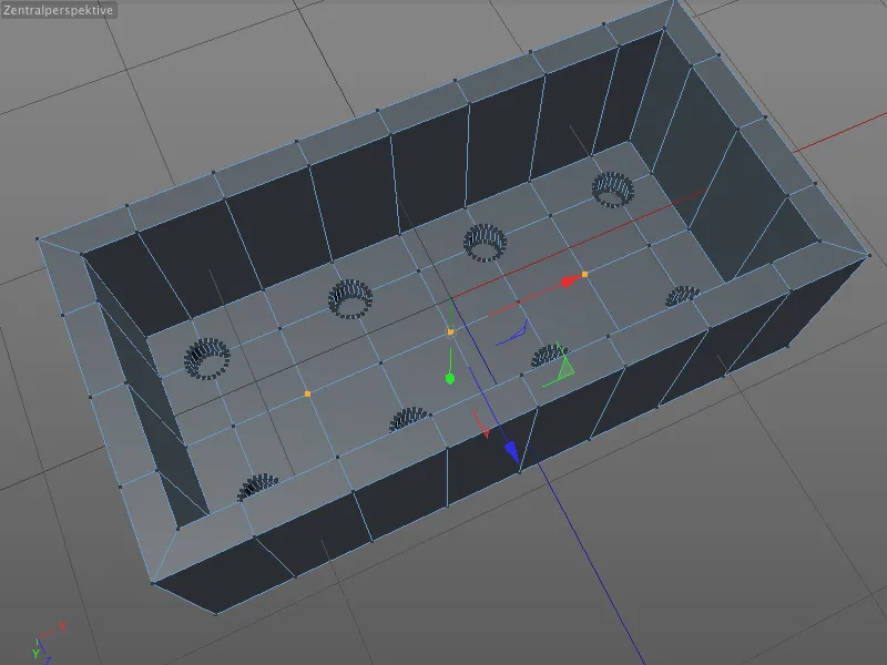 Analogo alla parte superiore del mattoncino LEGO, selezioniamo all'interno nel modo di modifica punti i totali otto punti centrali nella posizione dei bottoni. Poiché abbiamo evitato spostamenti geometrici durante l'estrusione dello spazio cavo, possiamo essere certi che tutte le posizioni siano corrette.