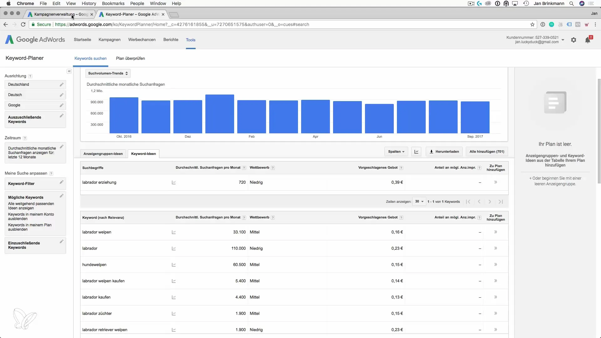 Se noti che una certa parola chiave non riceve abbastanza impressioni, è tempo di aumentare gradualmente l'offerta. Prova con piccole regolazioni, come 75 centesimi per "addestrare Labrador", e osserva come si sviluppano i clic e le impressioni. È importante essere pazienti; le modifiche richiedono tempo per mostrare i loro effetti.