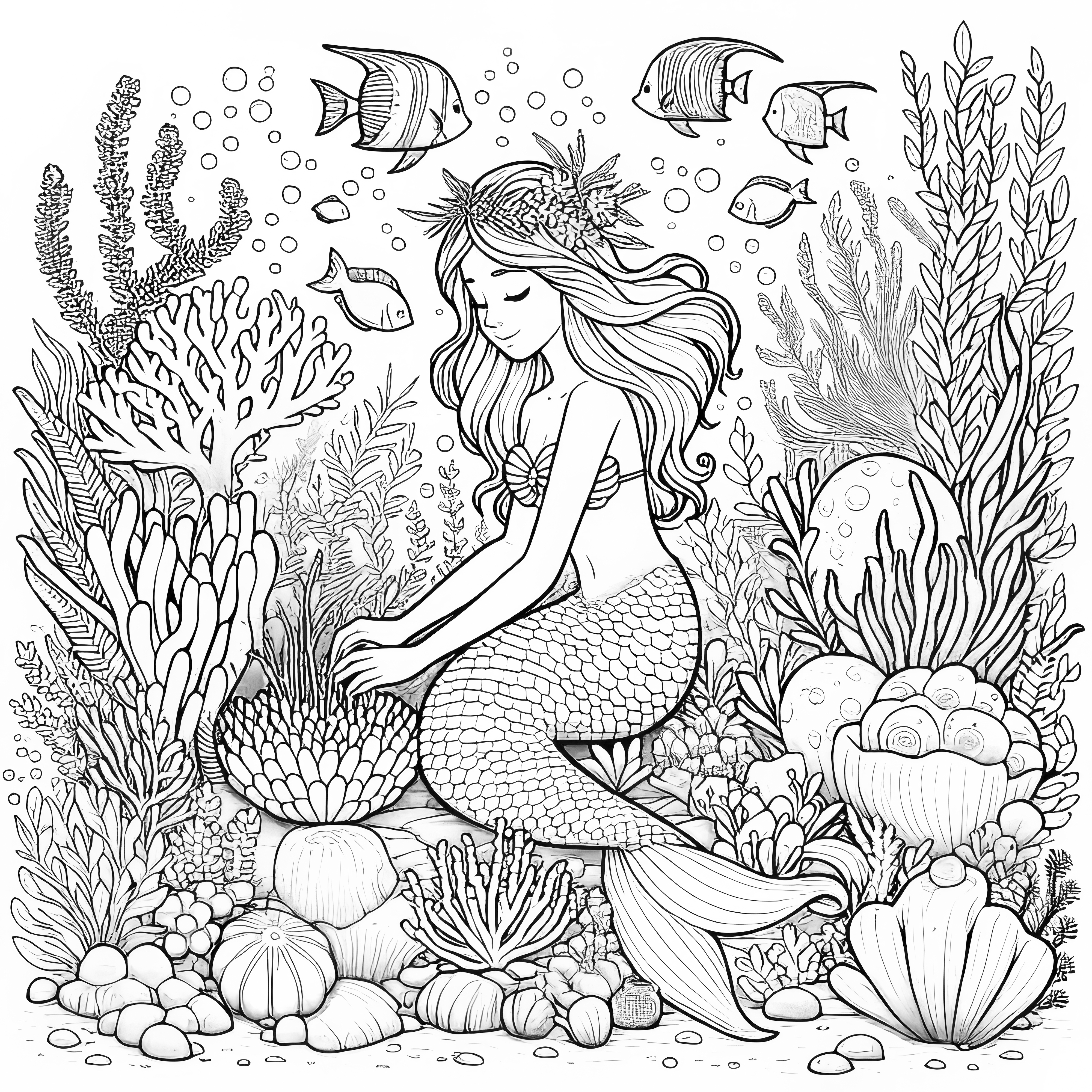 サンゴと魚のある人魚:大人のための塗り絵(無料)