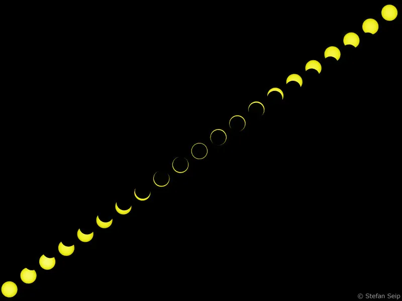2005年10月3日のスペインでの環状日食。 日食の進行を示す23枚の風景写真が追加され、チュートリアルシリーズ「アストロおよび天文写真撮影」の第7部で説明されています。 個々の写真の距離は自然に再現されていません: