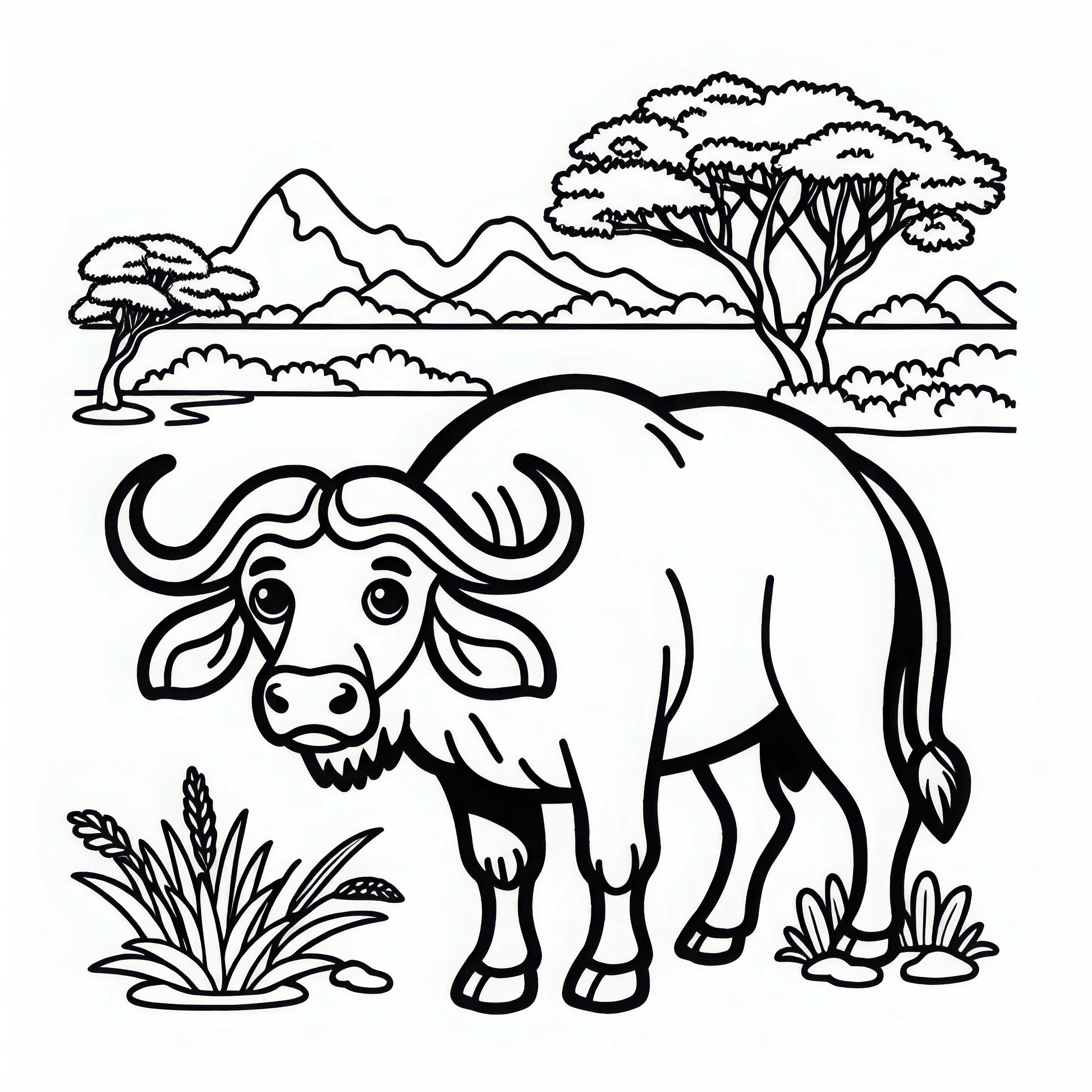 카프렌 버펄로가 기린 옆에서 평화롭게 풀을 뜯고 있는 그림 – 무료 색칠하기 자료