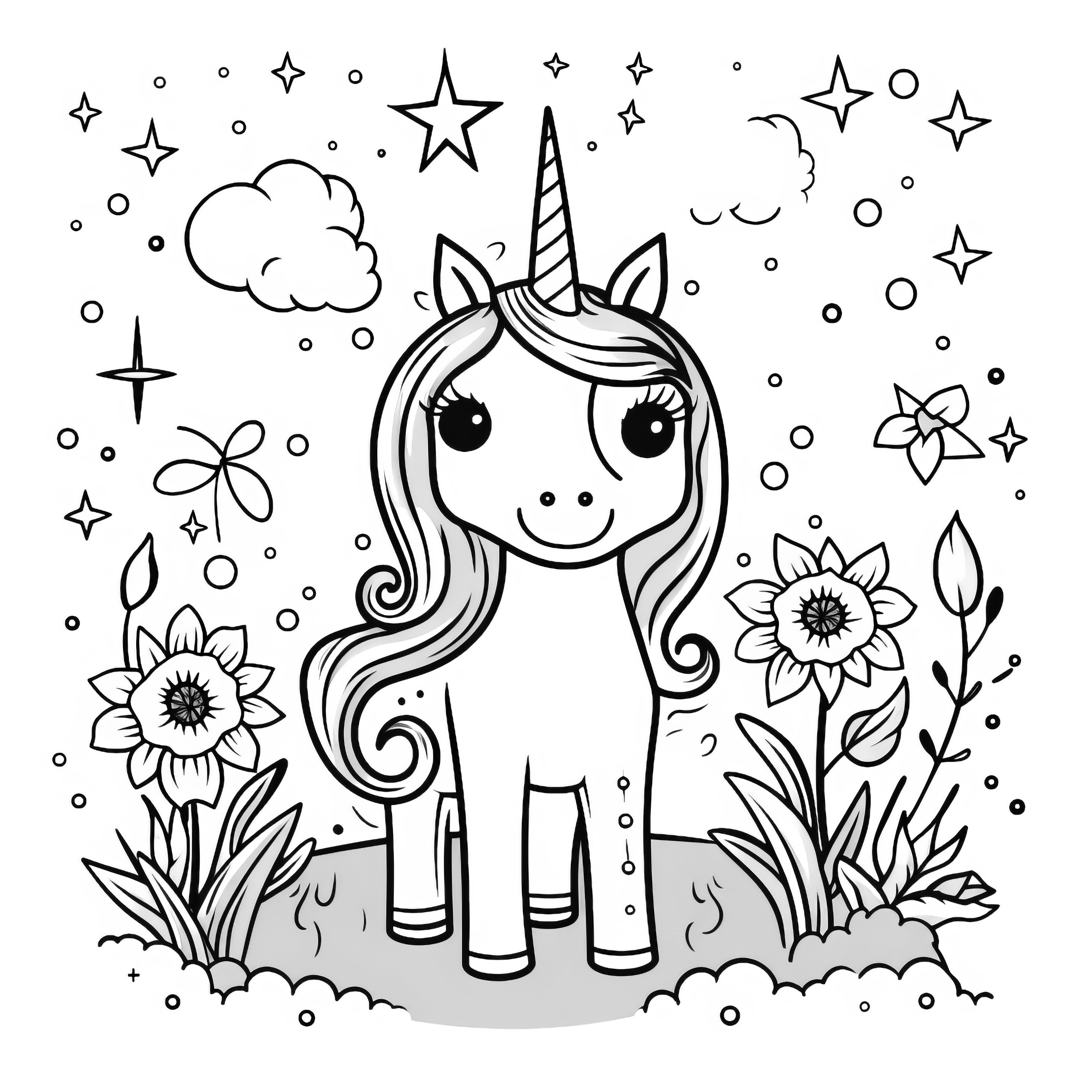 작은 유니콘 아이가 별들과 함께 색칠 공부 그림 (무료)