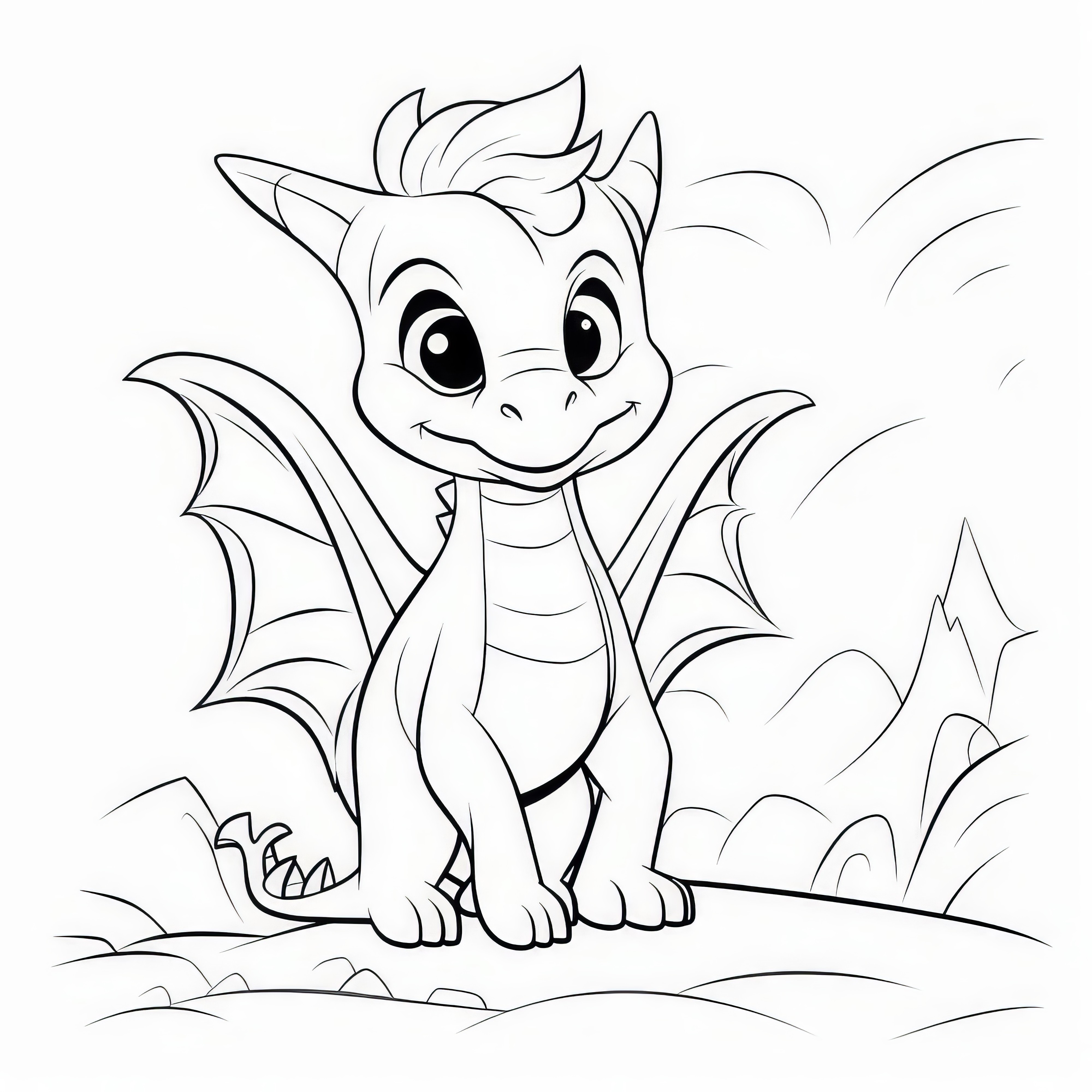 산 앞의 친근한 용: 무료 컬러링 그림 다운로드하기