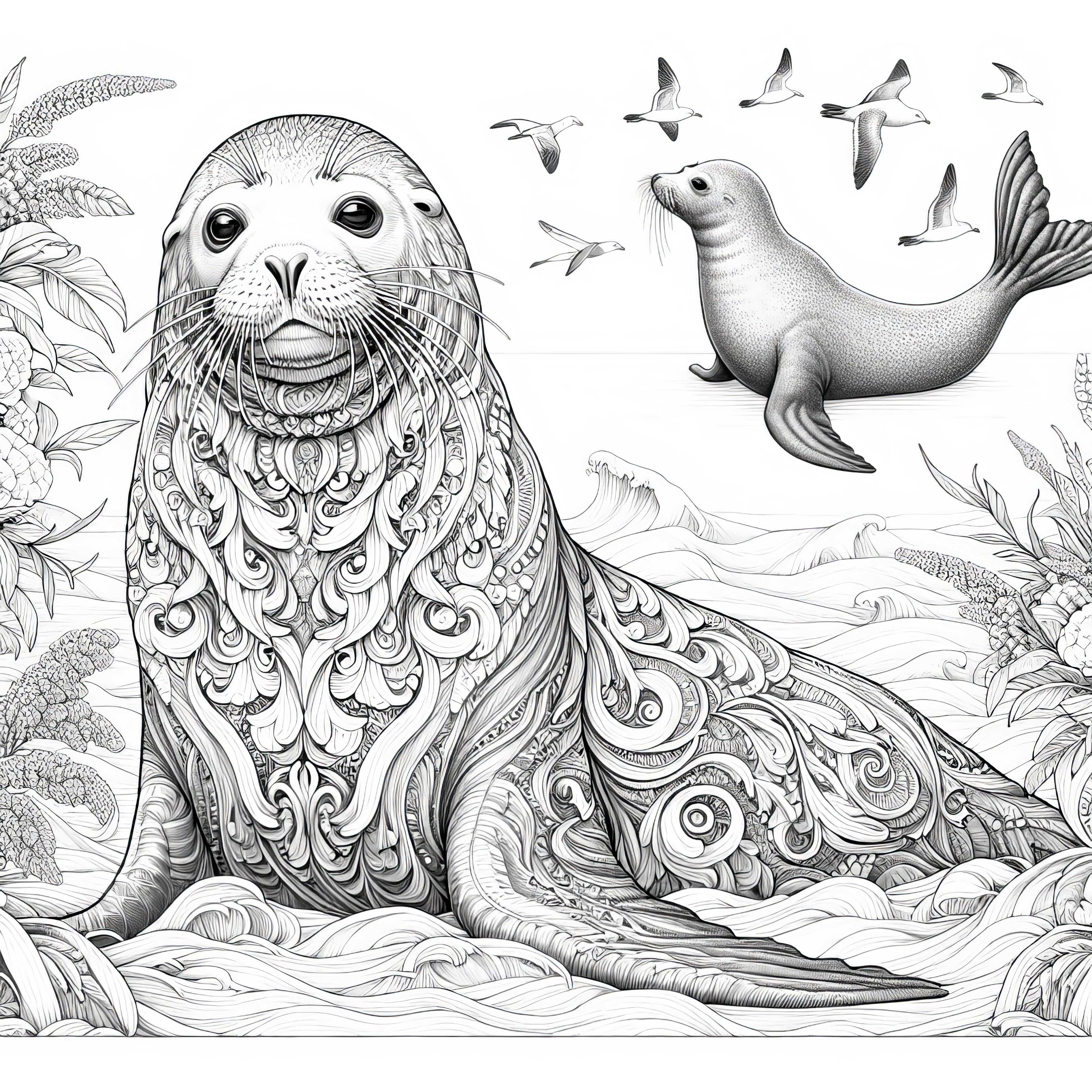 바다는 거품을 남기며 우아하게 잠수하는 물범 – 세밀하고 무료인 색칠하기 그림