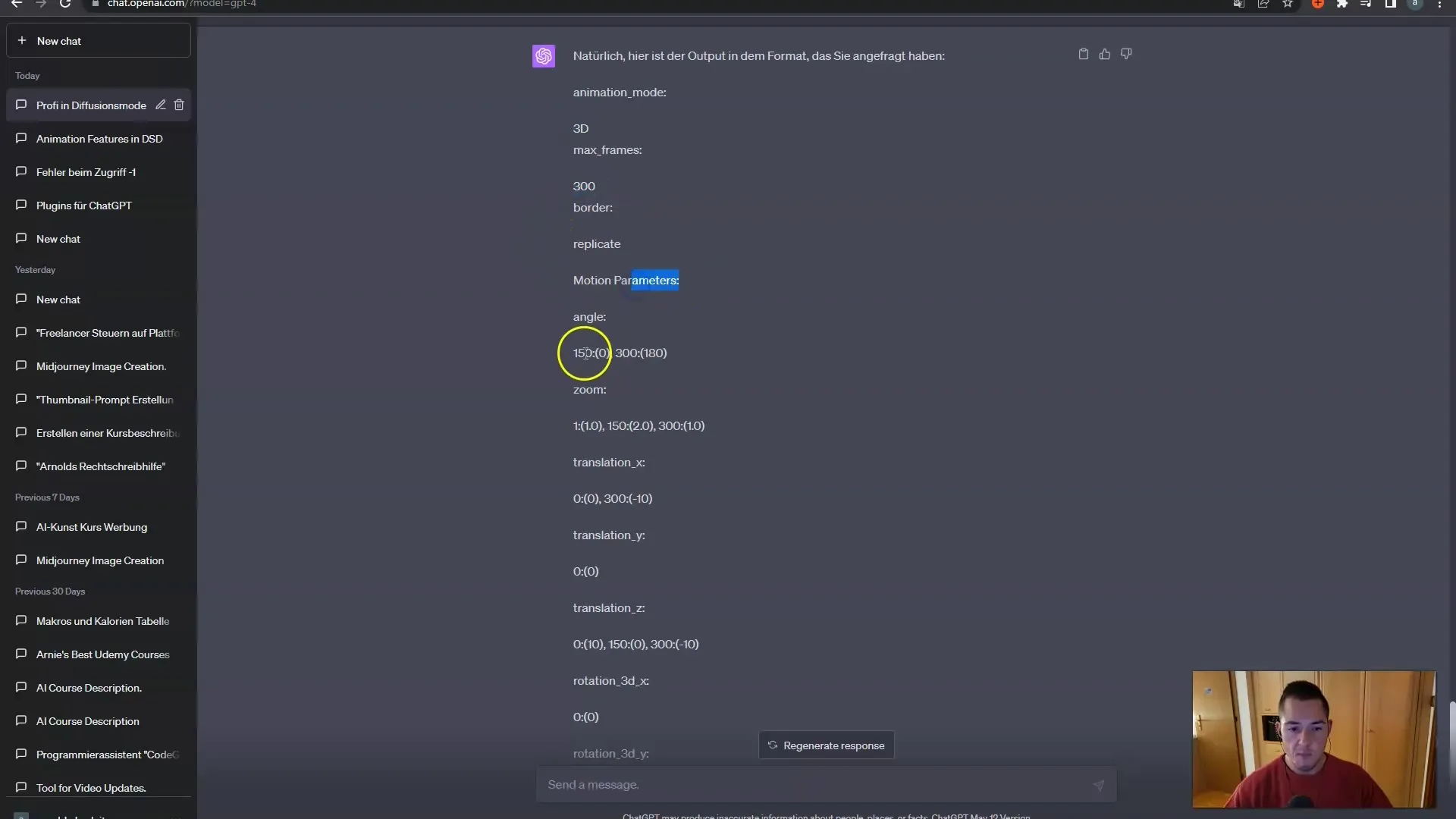 저는 ChatGPT를 설정한 명확한 작업부터 시작했습니다: 카메라가 저를 향해 왼쪽으로 움직이고 제가 180° 회전하는 300프레임의 동영상을 만들고 싶었습니다. 마지막에는 줌이 다시 뒤로 이동해야 합니다. 지침을 매우 정확하게 지키는 것이 중요합니다.