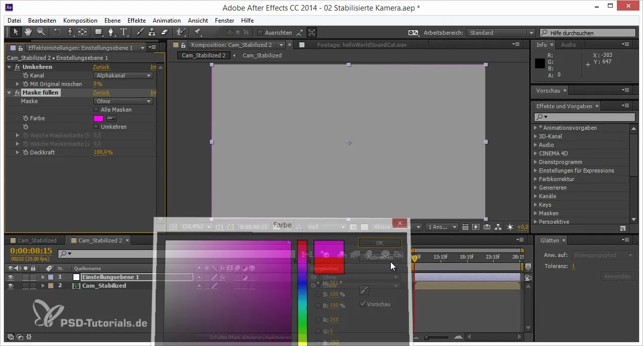 이제 가장자리를 최적화하기 위해 새로운 조정 레이어를 생성합니다. “레이어 새로 만들기”로 가서 “조정 레이어”를 선택합니다. 이 조정 레이어에서 "채널 반전" 효과를 적용하여 RGB의 알파 채널을 반전시켜 안정화로 인해 더 이상 보이지 않는 장면만 볼 수 있도록 합니다.
