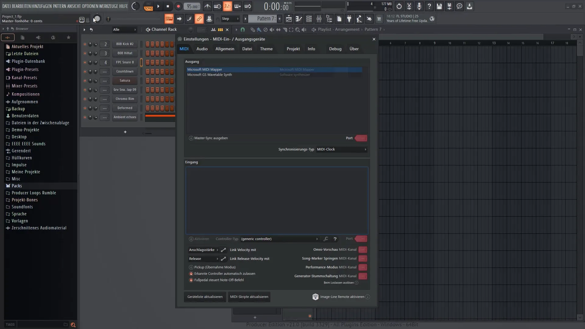 먼저 FL Studio에서 새 프로젝트를 만듭니다. 여기에는 이미 다양한 하드웨어 장치를 연결할 수 있는 옵션이 있습니다. 기본 요구 사항은 MIDI 키보드 또는 컨트롤러를 연결한 상태여야 한다는 것입니다.
