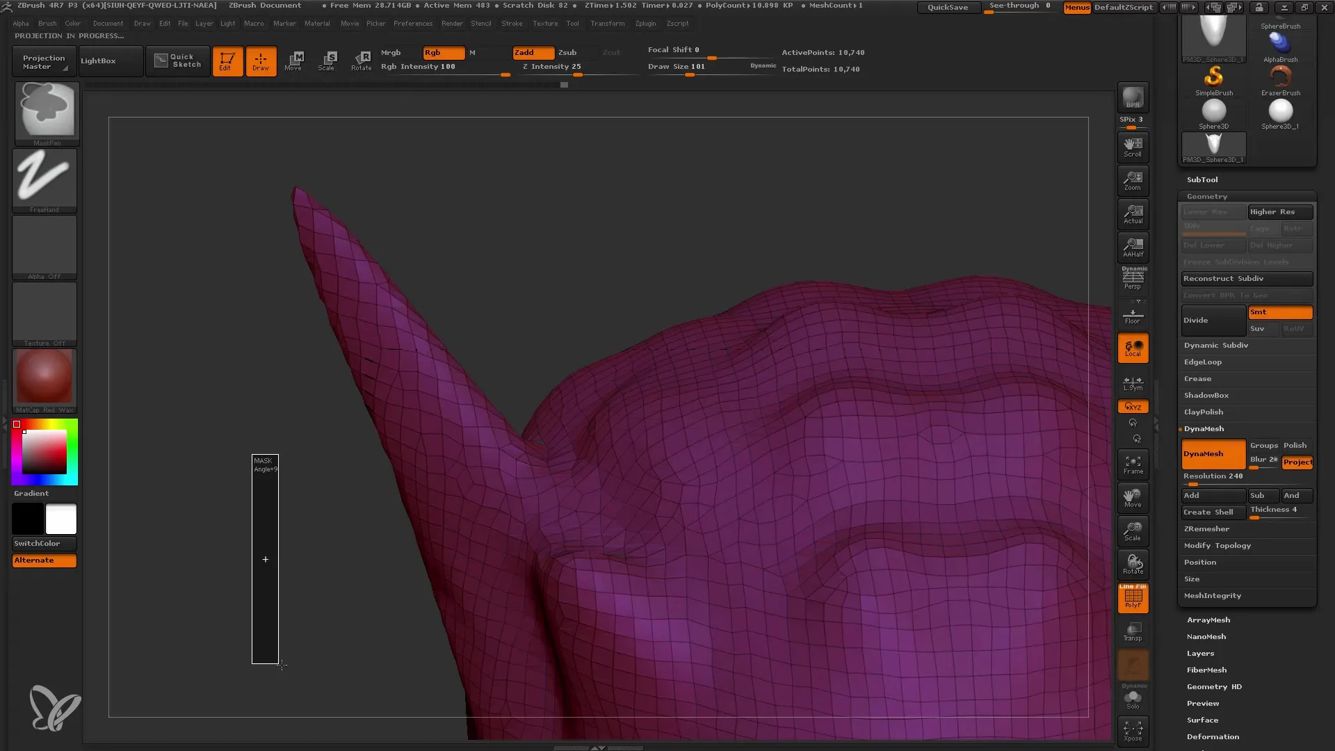 얼굴 윤곽이나 기타 특징과 같은 기본 형태를 만든 후 클레이 빌드업과 같은 보다 세부적인 브러시로 전환할 수 있습니다. 원하는 외양을 얻기 위해 여러 도구 설정을 실험하세요. 다각형이 일그러졌다고 느끼면 다시 다이네메시 기능을 활성화하세요.