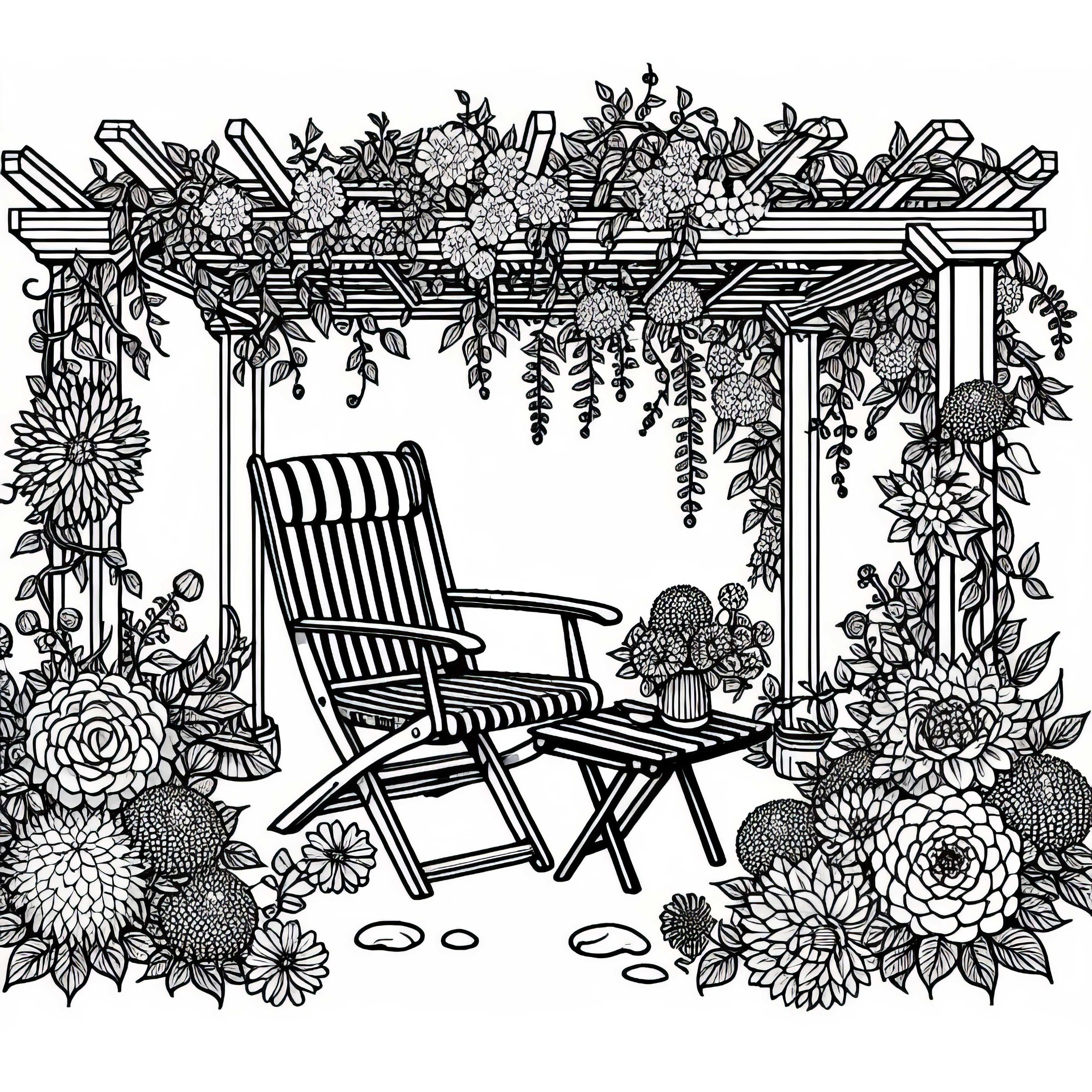 Sodo kėdė po pergola - nemokama sodo gėlių spalvinimo šablonas