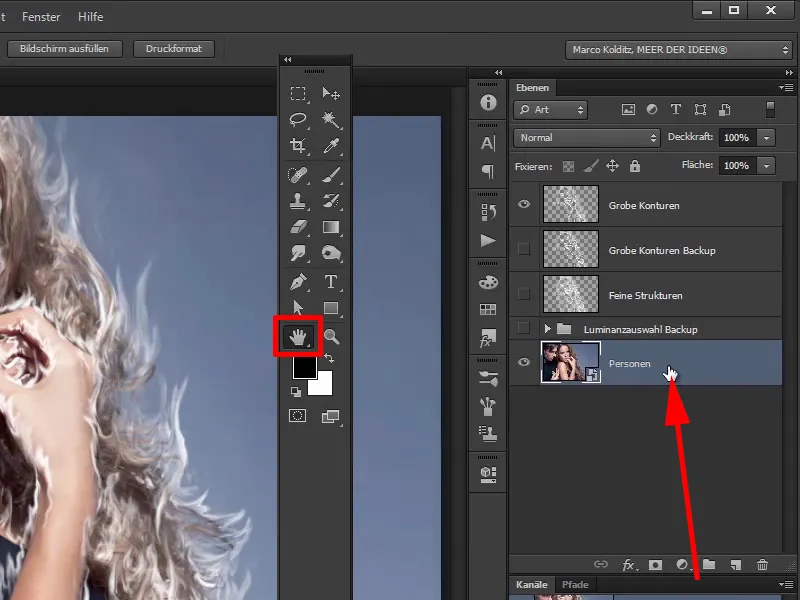 Turėdami 9 pikselių vertę, plaukai nebebus tokie aiškūs, bet vis dar aiškiai matomi. Kad suminkštėjimas veiktų tik ant plaukų, pasirinkite sluoksnį "plaukų suminkštėjimas" ir kuriama per mažus piktogramos (1) paspaudimą maskuotė (2).