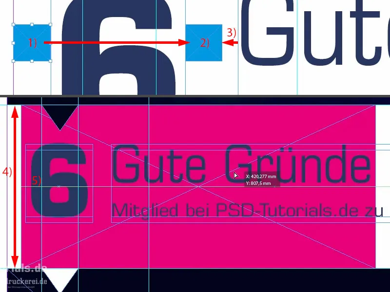 Tada fone galiu padėti svetainę iškelti ir naudodamasis Išdėstymas nustatyti jį foną (4). Dabar pažymiu abu, „6“ ir gerus argumentus, nes dabar turime aiškią nuorodą. Tai matote iš šios žalios linijos, kuri atsiranda viduryje (5). Dabar turime vidurį ir galime vėl ištrinti vietas laikinus.