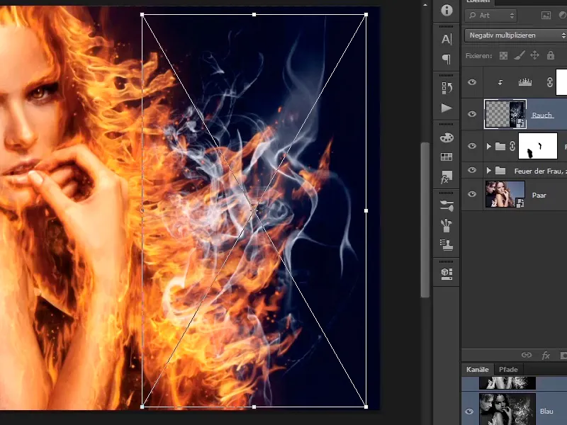 Dabar paspauskite Ctrl+T ir galėsite judinti dūmus. Galite juos sumažinti ir perkelti. Galbūt norėsite juos vėl apversti, gal net padidinti. Tiesiog pažiūrėkite, kas jums geriausia patinka. Galbūt net nereikia apversti, tiesiog pažiūrėkite, kas jums labiausiai patinka. Taip pat čia vėl galite pasimėgauti laiku ir vietos pasirinkimu ir patvirtinkite laikydami Enter klavišą.