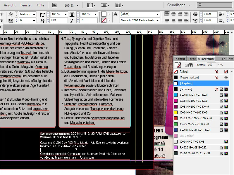 Kiekviename DVD yra pagrindinė informacija apie sistemos reikalavimus ar naudojamus multimedijos standartus. Ši informacija žinoma taip pat turi būti patalpinta šiame puslapyje. Tam dar kartą jums prireiks Teksto įrankio, su kuriuo paslenkate tekstyną po abiejais tekstų seklumais ir užpildote jį būtinomis žiniomis. Čia vėl buvo naudojamas Šrifto šriftas Eurostile LT Std, 8 pt šrifto dydis.