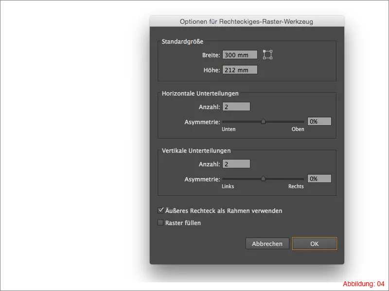 Standartiniam dydžiui pasirinkite 300x212 mm formatą. Horizontaliesiems ir vertikaliesiems padalijimams turite pasirinkti skaičių du. Asimetriją palikite 0 %. (04 pav.).