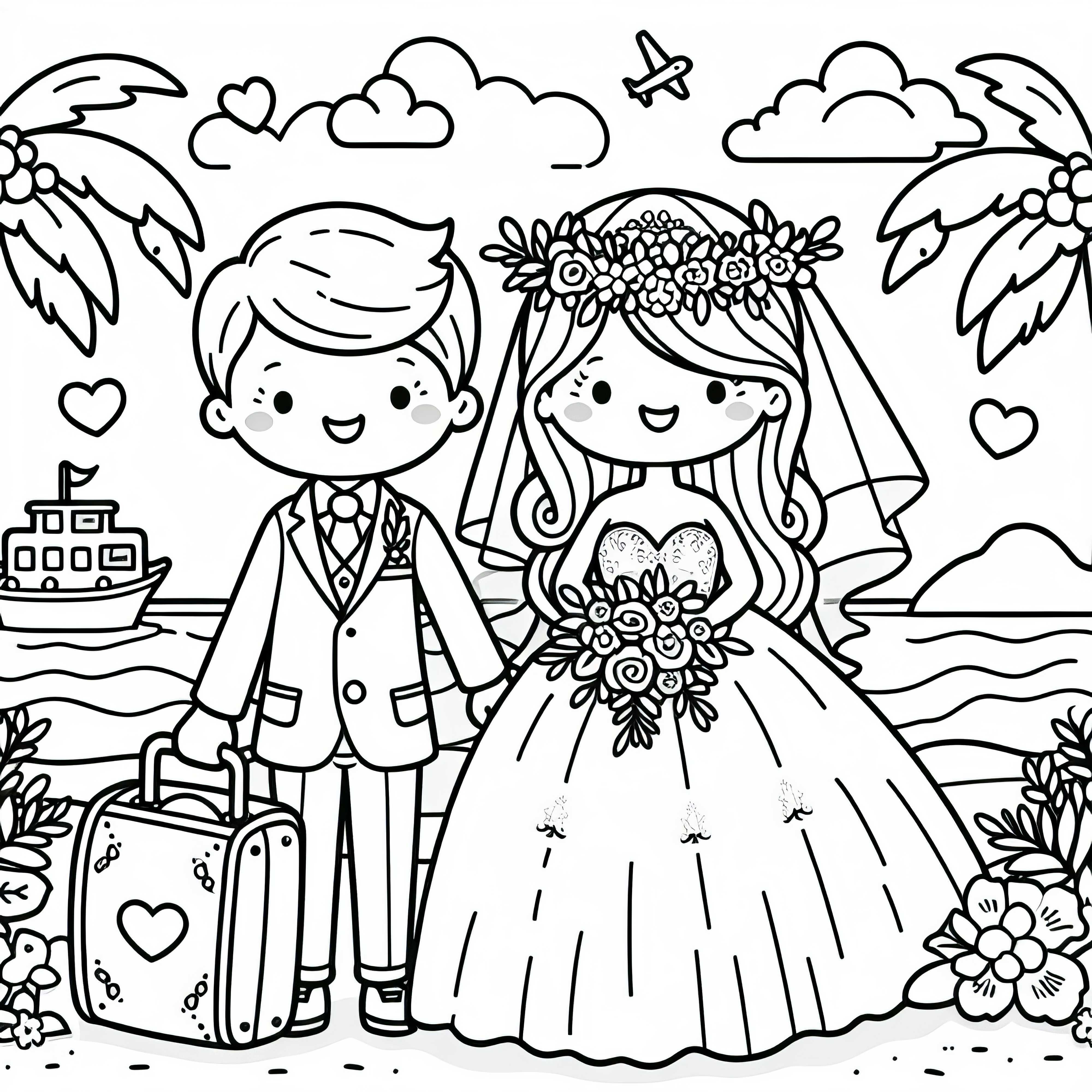 Līgavas un līgavaiņa iešana saulrietā: bezmaksas krāsojamā lapa