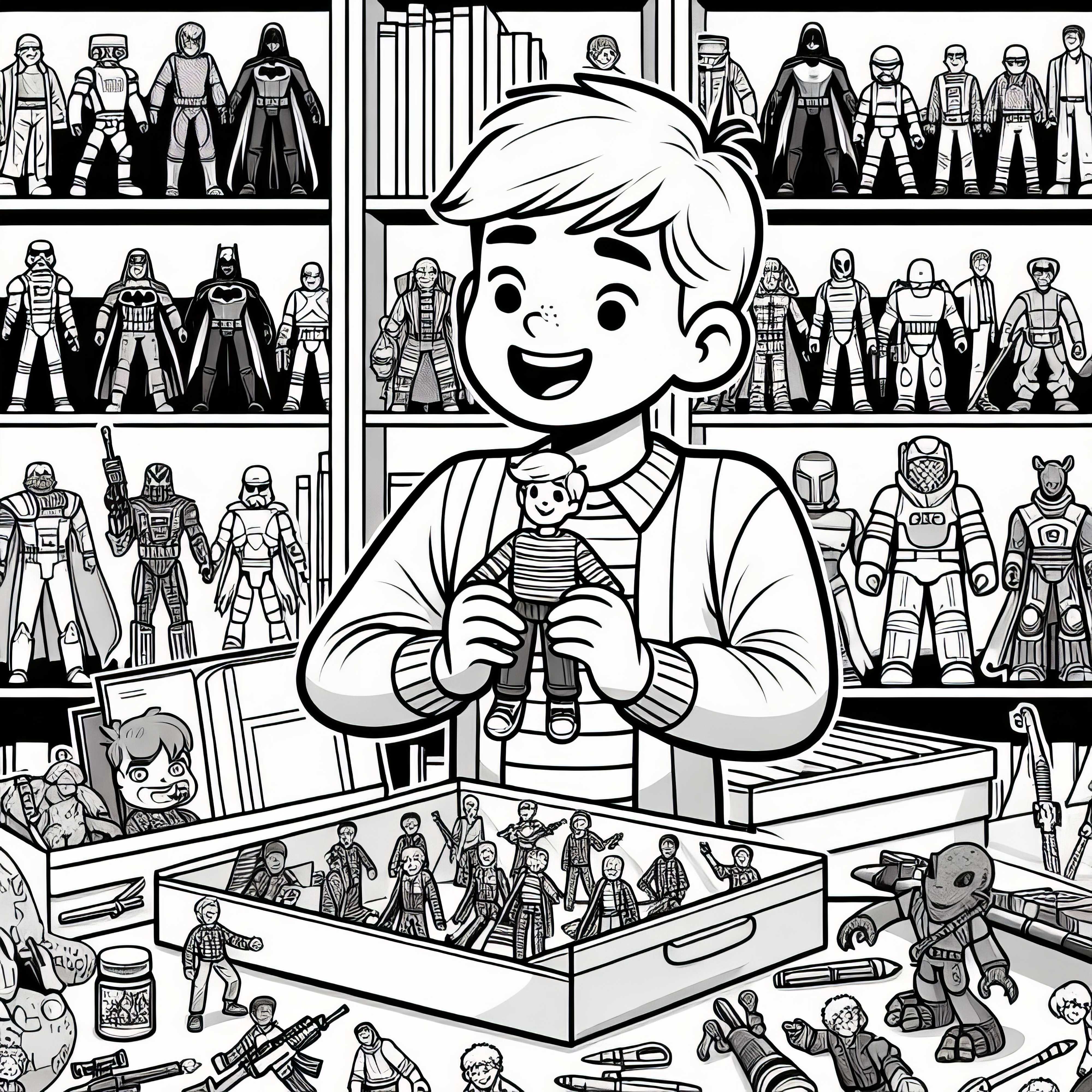 Priecājies par fantastisku krāsošanas veidni, kas ir lieliski piemērota ikvienam rīcības figūru kolekcionāram! Attēls rāda aizraujošu ainu, kas pilna ar rīcības figūrām, kas gaida, lai tu tās atdzīvinātu. Tu vari šo augstas kvalitātes krāsošanas attēlu viegli lejupielādēt bez maksas. Neatkarīgi no tā, vai tu vēlies to izdrukāt un izkrāsot ar krāsainām zīmulām vai marķieriem, vai arī labāk to krāsot tiešsaistē, izvēle ir tavās rokās. Noklikšķini tagad, lai lejupielādētu krāsošanas attēlu!