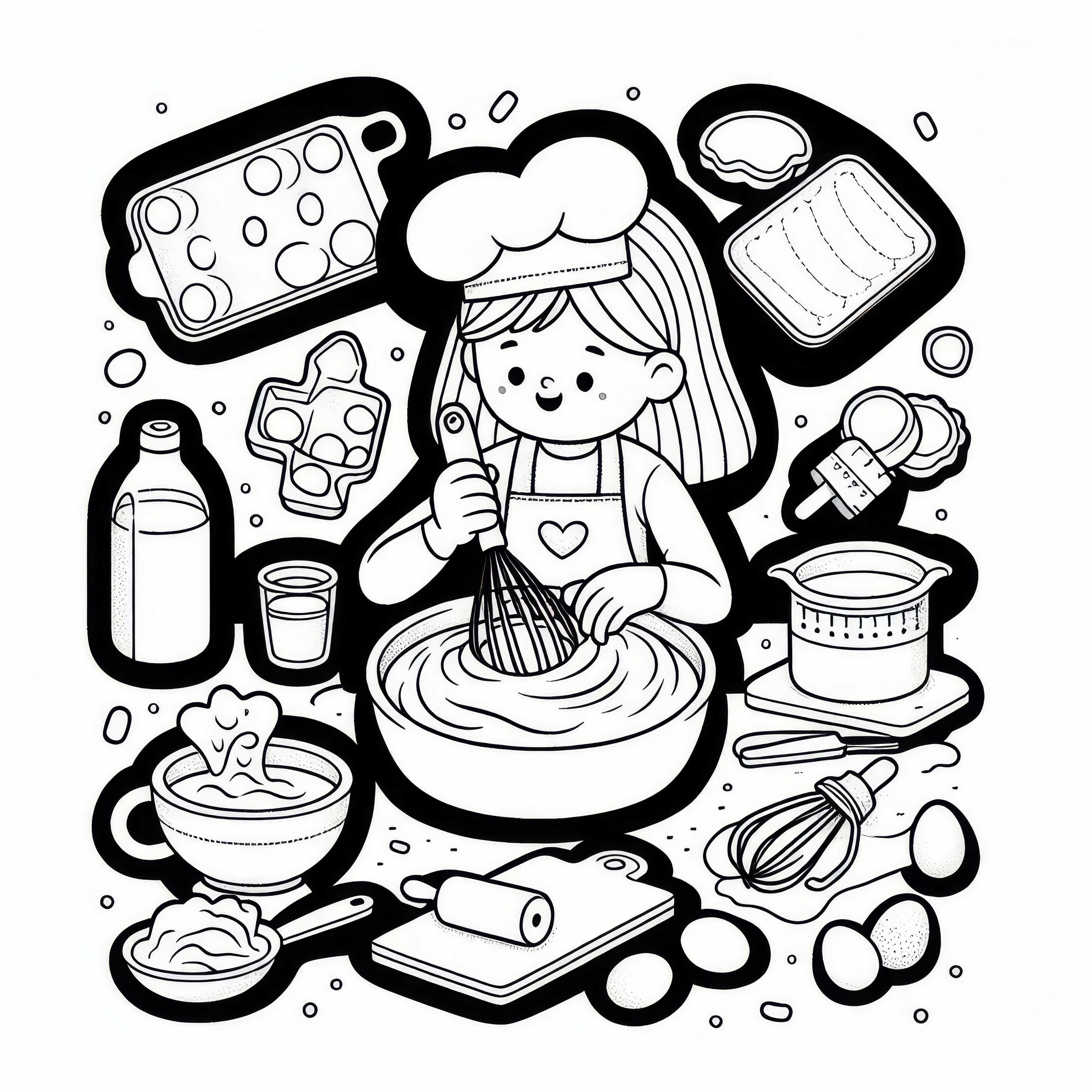 Attēlā par tēmu kūku cepšanu ir daudz ko atklāt. Tu vari veidot dažādās sastāvdaļas spilgtās krāsās. Mīklu tu vari krāsot brūnā vai bēšā krāsā, kamēr glazūra var mirdzēt maigās pasteļtoņos. Daži svaigi augļi vai šokolādes gabaliņi var pievienot papildu krāsu akcentus. Attēls ir pieejams bez maksas, tam ir JPG formāts un tas ir lieliski piemērots izdrukāšanai vai krāsošanai tiešsaistē. Izmanto izdevību ļaut vaļu savai fantāzijai!