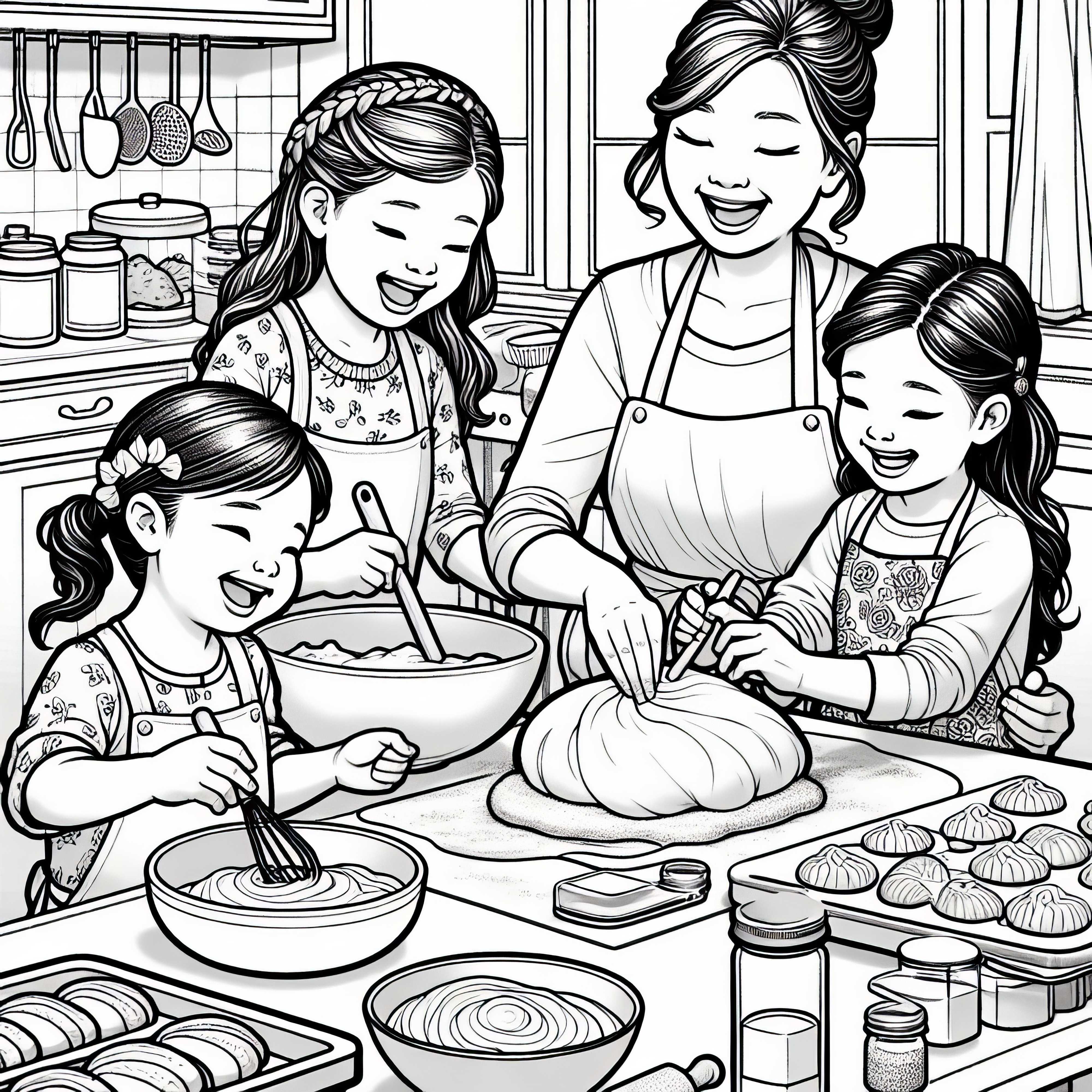 Šis krāsojamā attēla sniedz lielisku iespēju, kopā ar savu ģimeni būt radošiem cepšanas procesā. Tajā redzama priecīga ģimene virtuvē, kas kopā cep. Attēls ir lieliski piemērots bērniem un pieaugušajiem, lai izbaudītu krāsošanu vai vienkārši kā radošu novēršanas līdzekli. Īpaši ir tas, ka tu vari bez maksas lejupielādēt krāsojamo attēlu. Tas ir pieejams augstā kvalitātē kā JPG fails un to var krāsot arī tiešsaistē. Tātad, lejupielādē krāsojamo attēlu un palielini savu radošumu!