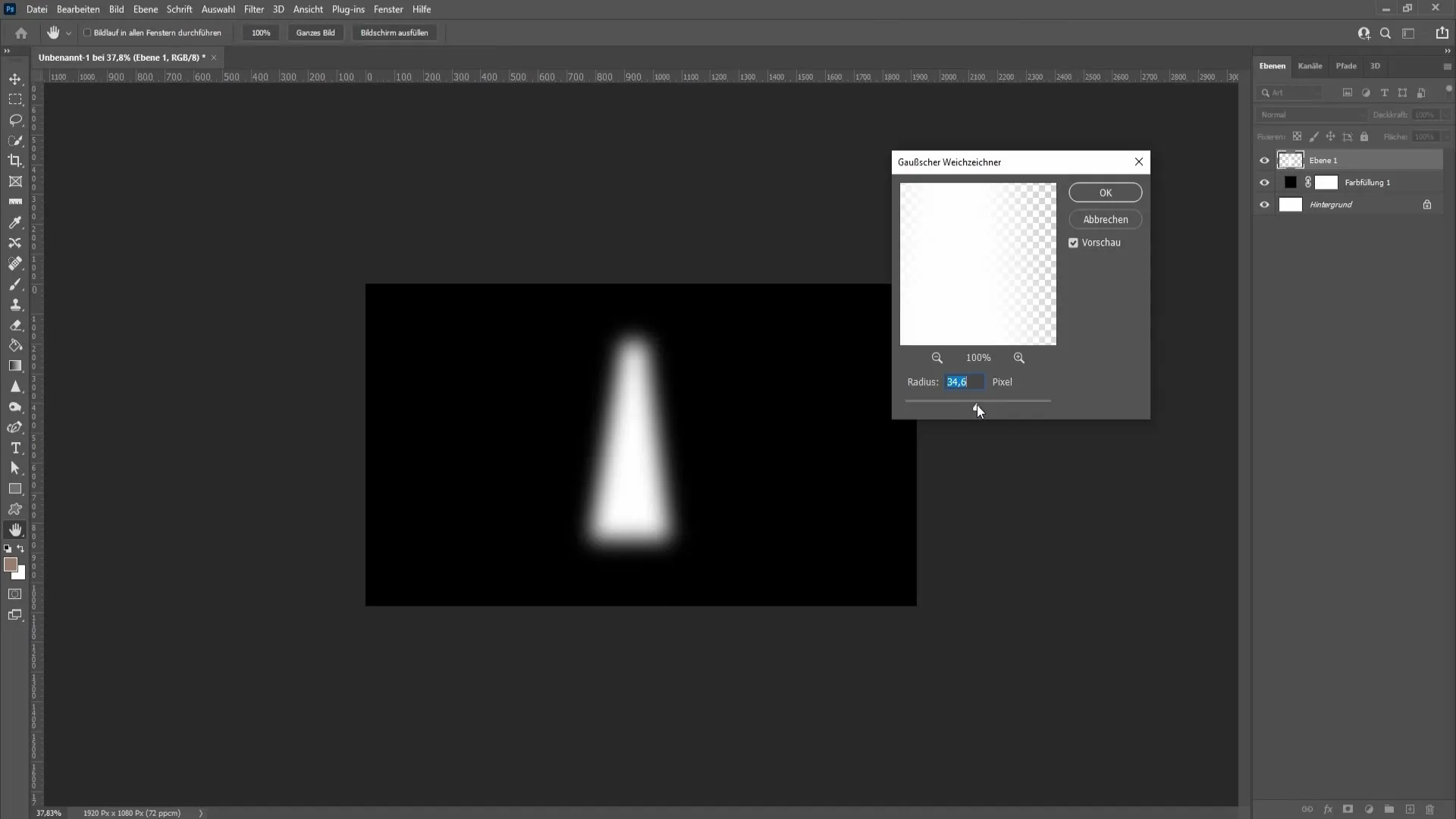 Apstipriniet transformāciju ar taustiņu Enter. Tagad ir izveidots pirmais starmeša konuss. Tālāk ir jānopludina malas, lai panāktu tipisku gaismas efektu. Dodieties uz "Filter" (Filtrs), pēc tam uz "Blur filter" (Izplūšanas filtrs) un izvēlieties "Noise blur" (Trokšņa izplūšana).