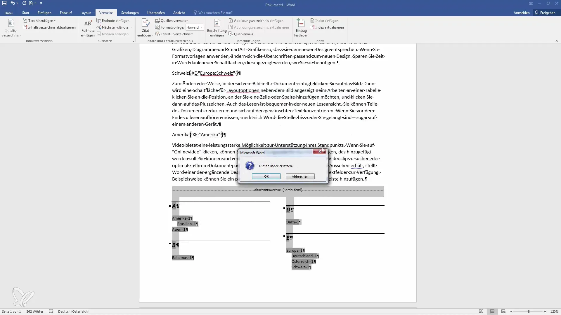 Piemēram, par galveno ierakstu ņemiet Eiropu. Ievadiet Europe un izvēlieties to kā galveno ierakstu. Noklikšķinot uz "Aizvērt", šis ieraksts tiks saglabāts jūsu dokumentā, pat ja jūs to tieši neredzēsiet.