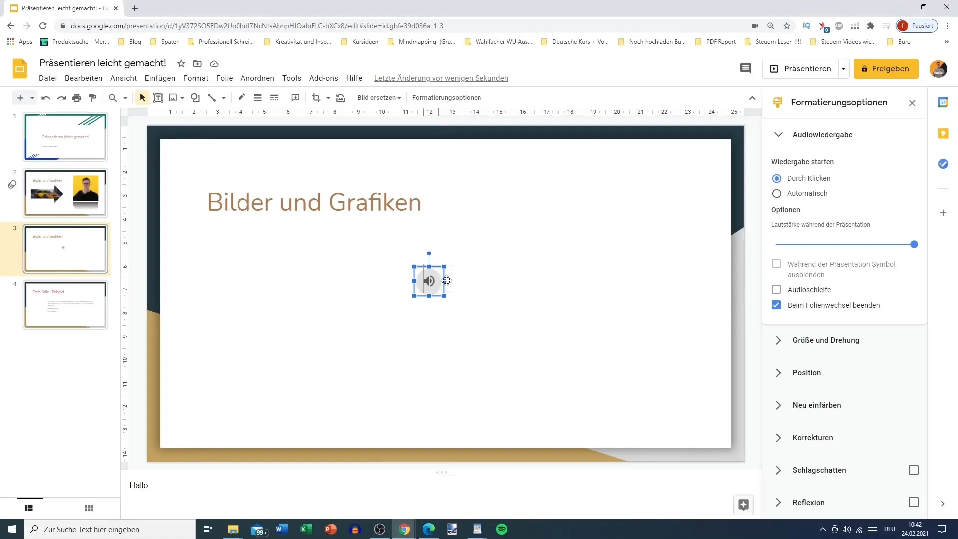Kad esat veicis visus iestatījumus, prezentācija jāpārbauda. Lai to izdarītu, atveriet sadaļu "Prezentēt" un pārbaudiet, vai audio tiek atskaņots atbilstoši prasībām.