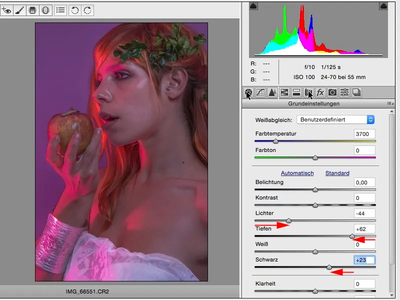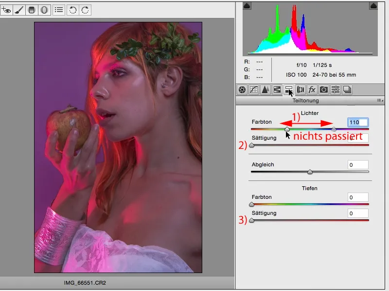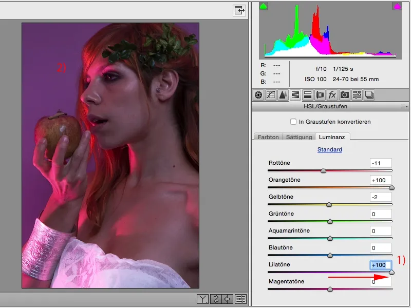 Ja vēlos to padarīt gaišāku vai tumšāku, man ir iespēja to precīzi pielāgot RAW. Un manai gaumei es gribētu, lai tā būtu nedaudz tumšāka (1). Tad es skatos uz oranžo krāsu: Ādā, galēji kreisajā pusē matos un ābolā ir mazliet oranžas krāsas. Jā, es to pavelkšu uz leju, es to pavelkšu uz augšu, es noteikti to pavelkšu līdz galam (2), jo tad ābols iegūst mazliet vairāk krāsas un mati šeit aizmugurē iegūst mazliet vairāk spīduma (3).