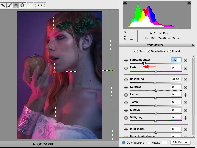 Paskatīsimies, ko vēl mēs varam uzlabot vai kādu izskatu mēs šeit varam radīt. Šobrīd esam tikai nedaudz optimizējuši krāsu un kontrastu. Attiecībā uz piesātinājumu es nedarītu neko daudz vairāk, un attiecībā uz krāsu toni: tagad es varu redzēt, kas šeit notiek, ja es pavelkšu slīdņus nedaudz ekstrēmāk. Tādējādi es šeit iegūstu oranžas krāsas pavedienus, ābols izskatās diezgan foršs, bet galu galā tas nav tas, ko es vēlos...