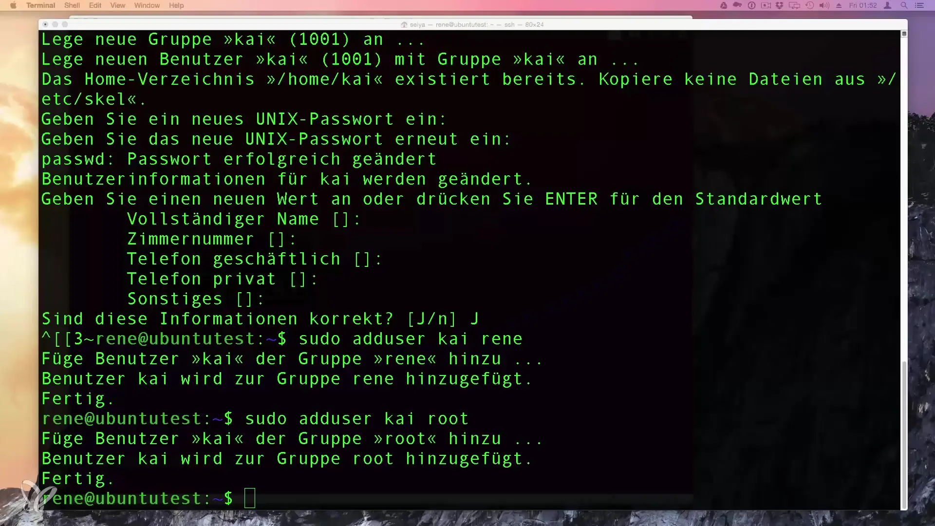 Als Kai ook als systeembeheerder moet optreden, kun je hem bovendien toegang tot de groep "root" geven. Dit kan met de volgende opdracht: