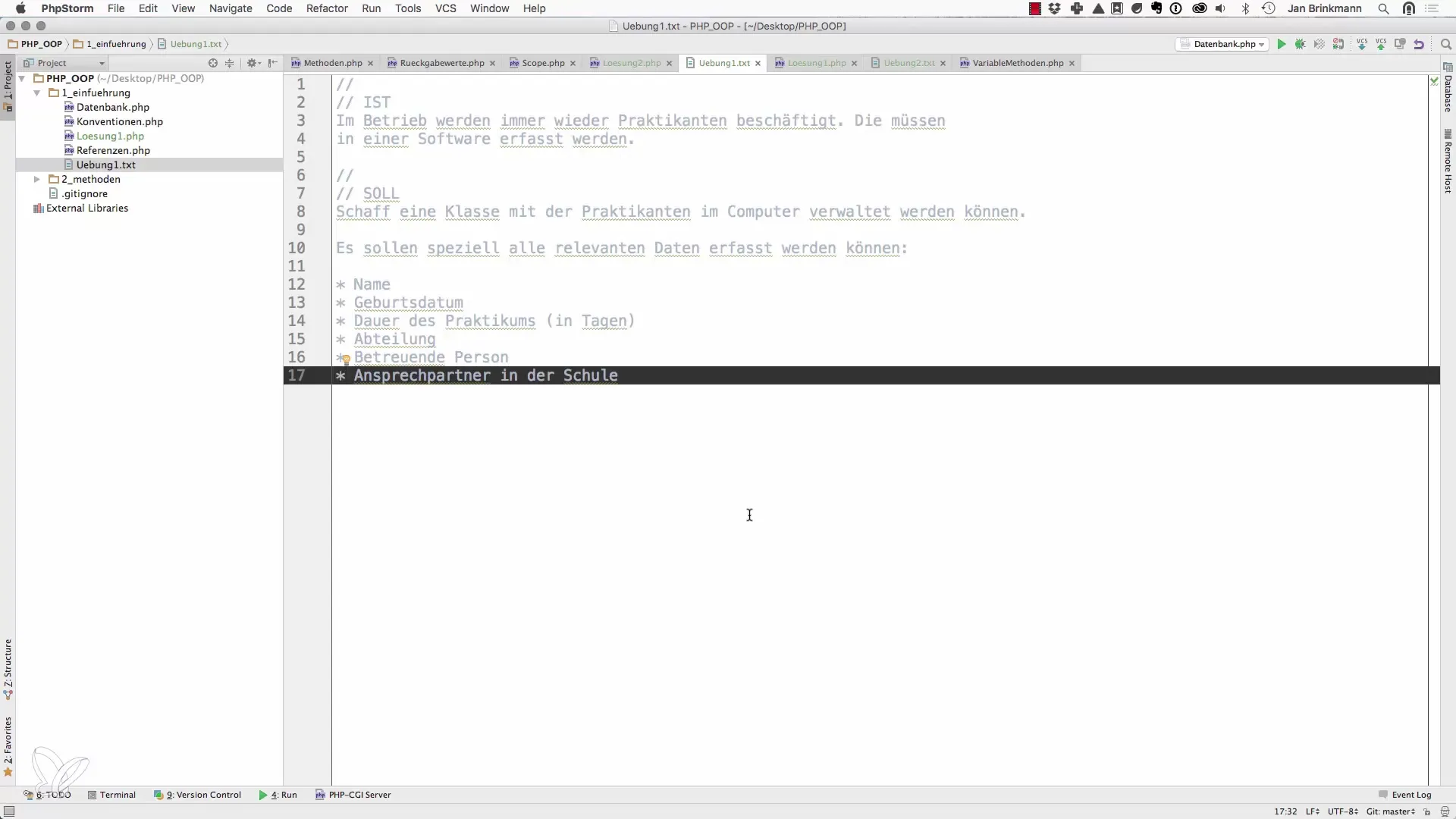 In de eerste stap maak je de klasse Stagiair. Dit is de centrale component van je applicatie, die alle eigenschappen en methoden voor het beheer van stagiaires zal bevatten. Noem de klasse volgens de naamgevingsconventies in PHP, om duidelijk en begrijpelijk te blijven.