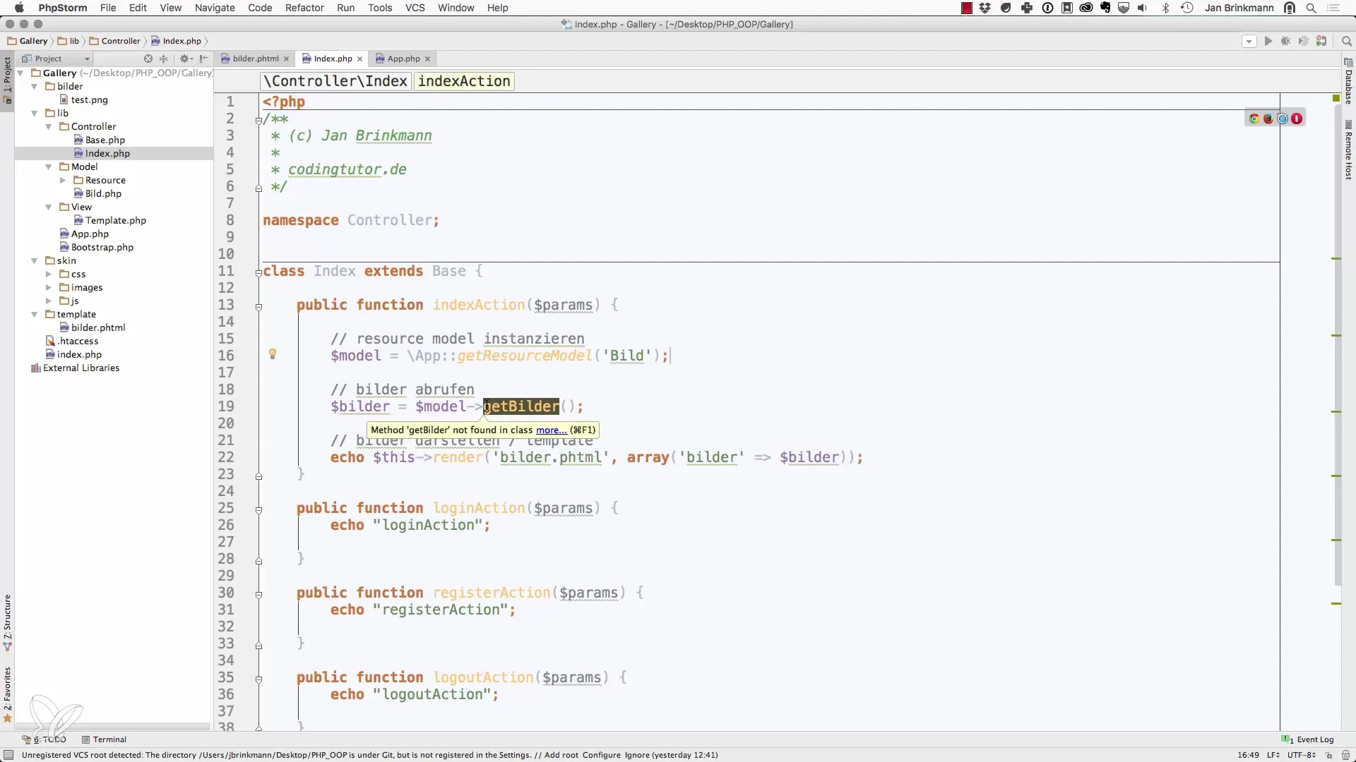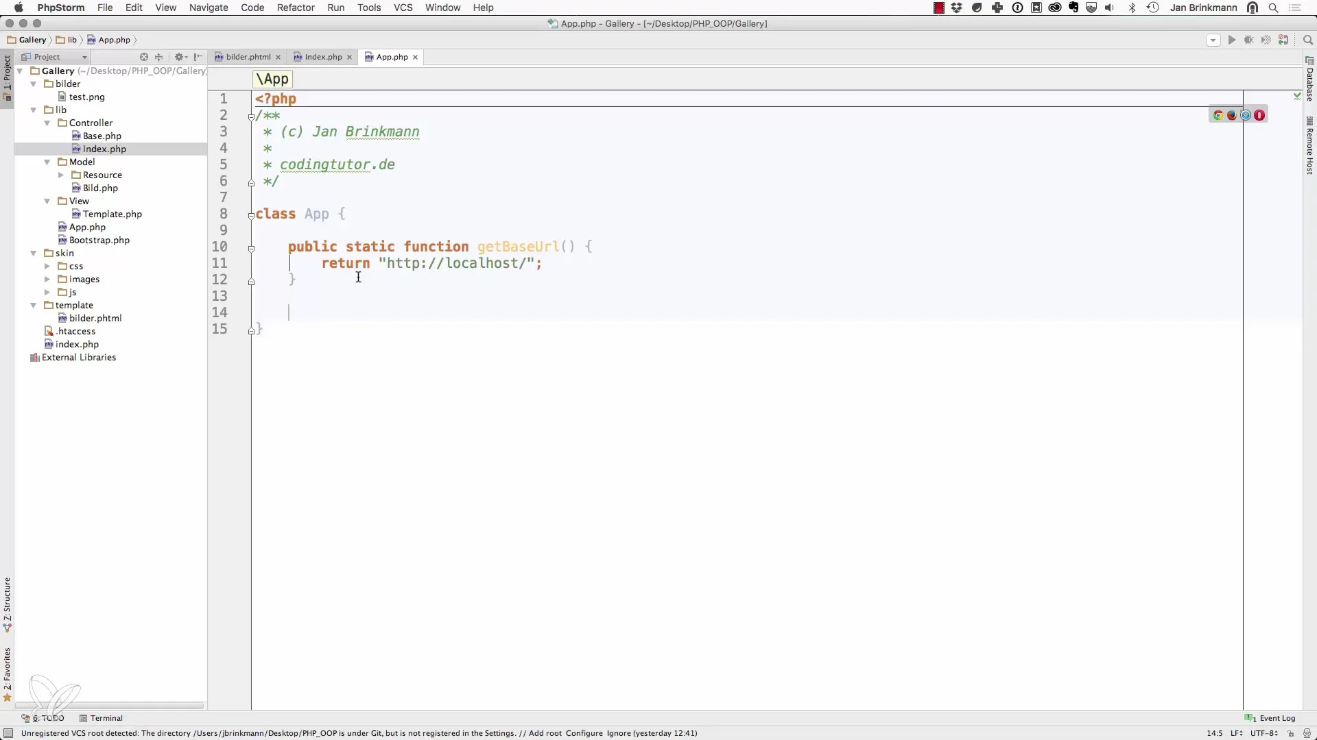 Ga eerst naar je app.php-bestand om de App-klasse een methode toe te voegen die het Factory-Pattern implementeert. Deze methode zal je helpen bij het creëren van nieuwe modellen.