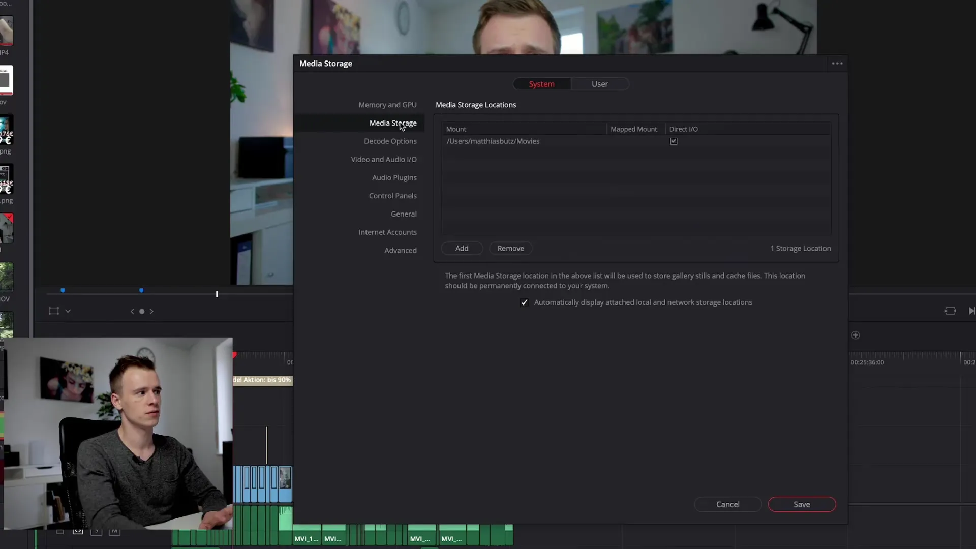 In het gebied „Media-opslag“ kun je de opslaglocatie voor proxy-bestanden en cache-bestanden bepalen. Het is aan te raden om deze op de snelste schijf te plaatsen die je tot je beschikking hebt, zoals een SSD. Zorg ervoor dat de externe harde schijf constant verbonden is, zodat er geen problemen tijdens het bewerken optreden.