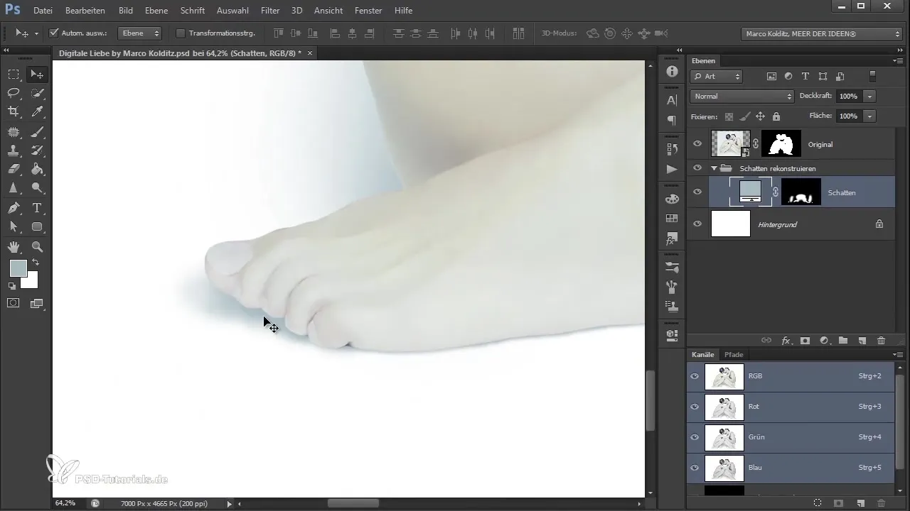 Kijk naar de originele afbeelding om ervoor te zorgen dat de schaduwen er realistisch uitzien. Je kunt de dekking van het penseel aanpassen voor een zachte overgang. Schilder voorzichtig langs de contouren en experimenteer met verschillende instellingen om de beste resultaten te behalen.
