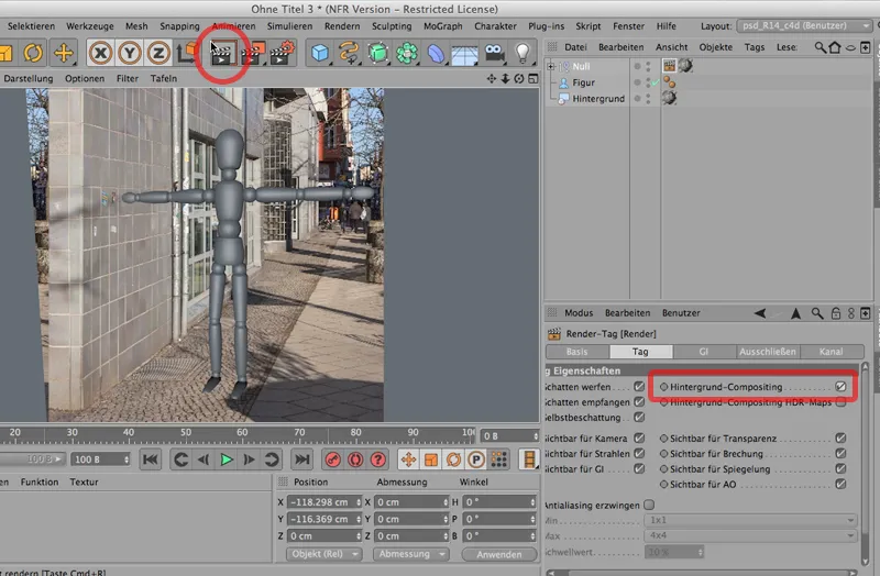 Dat klik ik aan en geef het hier een achtergrondcompositie. En als ik nu opnieuw render, dan is er niets meer te zien, maar mijn voorbereidingen zijn in principe al gedaan.