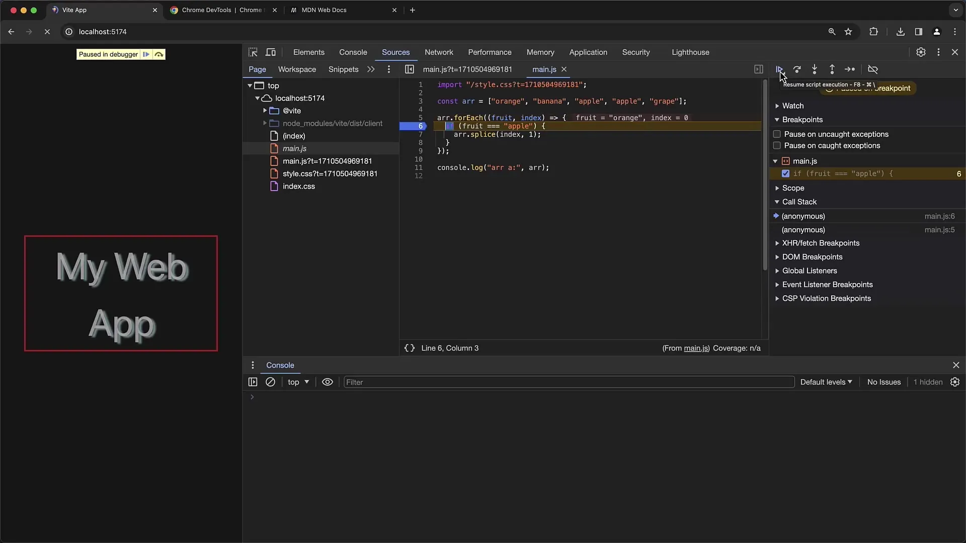 Om de breakpoint te bereiken, vernieuw de pagina. Dit kun je doen door op F5 te drukken of door op de vernieuwknop in de adresbalk te klikken. De uitvoering moet stoppen op het punt waar je de breakpoint hebt ingesteld.
