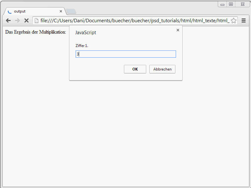 </html>Als je de pagina opent, verschijnt er een Prompt-venster waarin de eerste waarde wordt gevraagd.