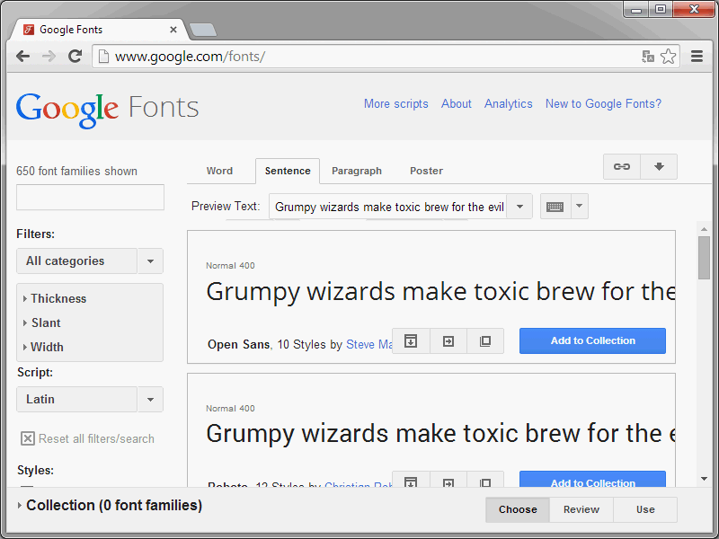 }Als u wilt, kunt u op uw pagina ook meerdere Webfonts gebruiken. Hiervoor klikt u op http://www.google.com/fonts bij de gewenste Webfonts op Add to Collection. Wanneer alle Webfonts in uw eigen collectie staan, opent u onderaan de pagina Use. Daar wordt direct een soort meter weergegeven.