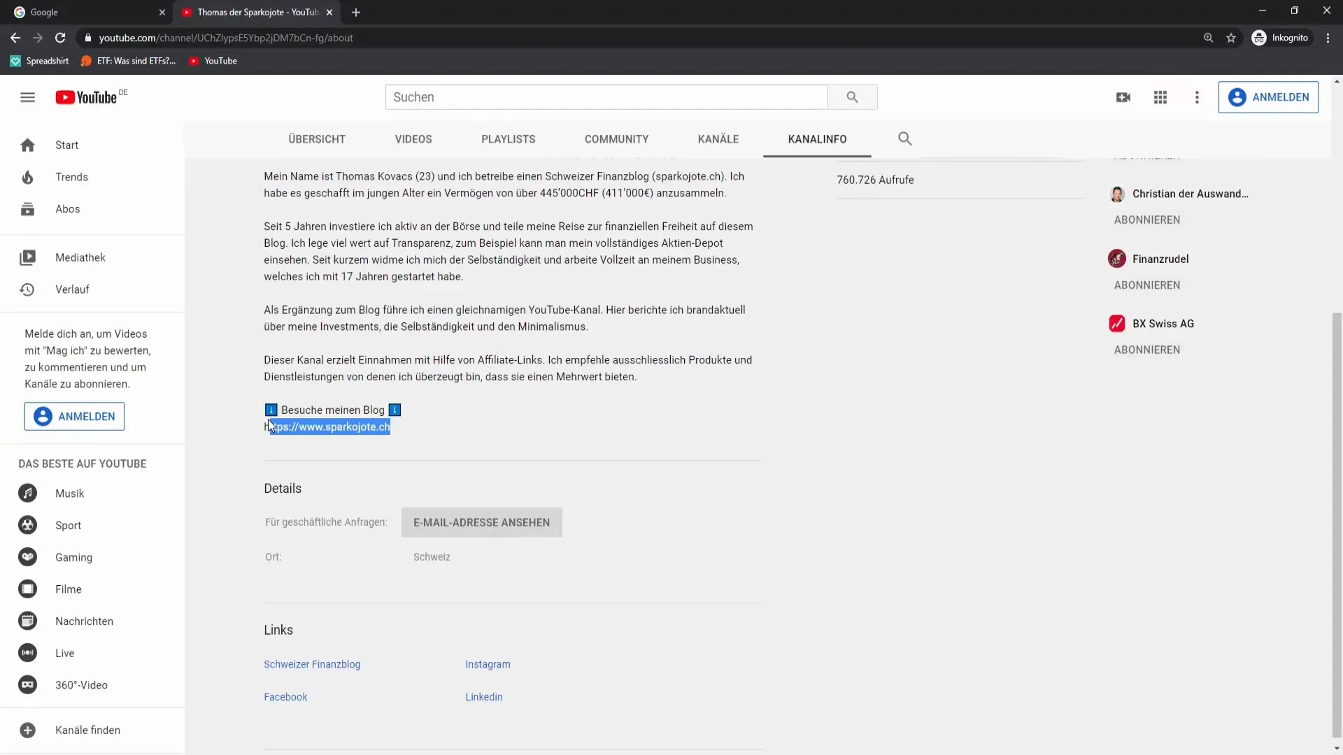 Bekijk het voorbeeld van het kanaal "Sparfuchs". Hier wordt al aanzienlijk meer geïnvesteerd in de kanaalbeschrijving. Naast de naam van het kanaal is er een korte persoonlijke introductie van de kanaaleigenaar en een uitleg over waar het kanaal over gaat. Een goed gestructureerde beschrijving kan potentie benutten.