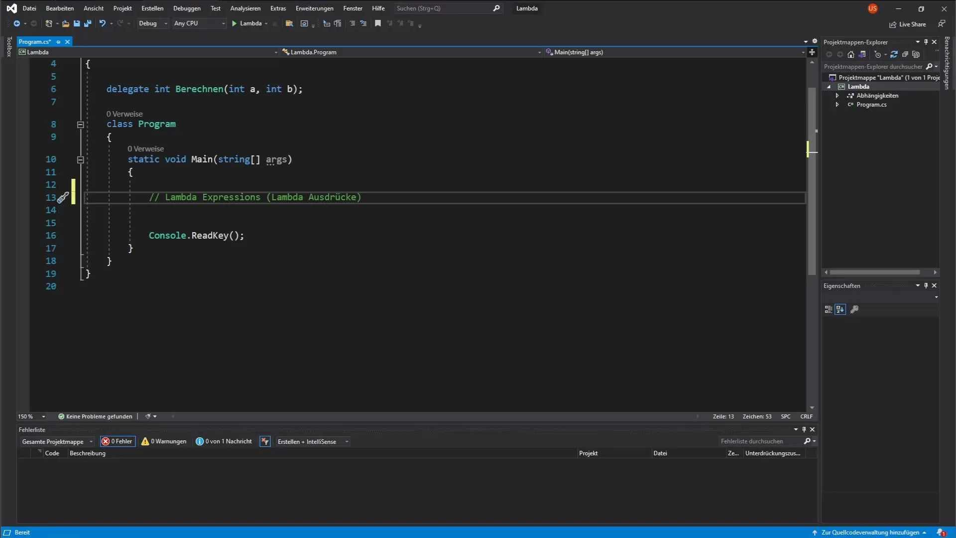 Laten we nu een variant bekijken die Lambda-uitdrukkingen in combinatie met delegates gebruikt. Eerst heb je een delegate nodig om een methode te definiëren. In dit eenvoudige voorbeeld ga je een deling uitvoeren.