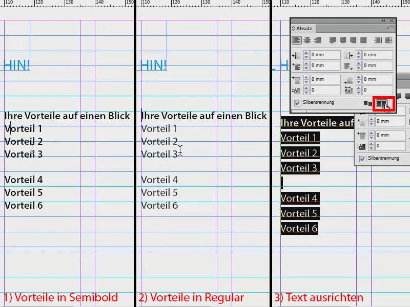 En dit wil ik nu niet in Halfvet hebben. Voor de hoofdkop is dat helemaal prima, maar de afzonderlijke opsomming wil ik in Normaal. Dus markeer ik dat en zet het op Normaal (2). Dit is trouwens de Myriad Pro, dat is een zeer goed uitgerust lettertype met veel lettertypen, en daarom vind ik dat fijn, omdat je er heel flexibel mee kunt werken. Dit alles nogmaals markeren en dan via Object>Alinea uitlijnen (3).