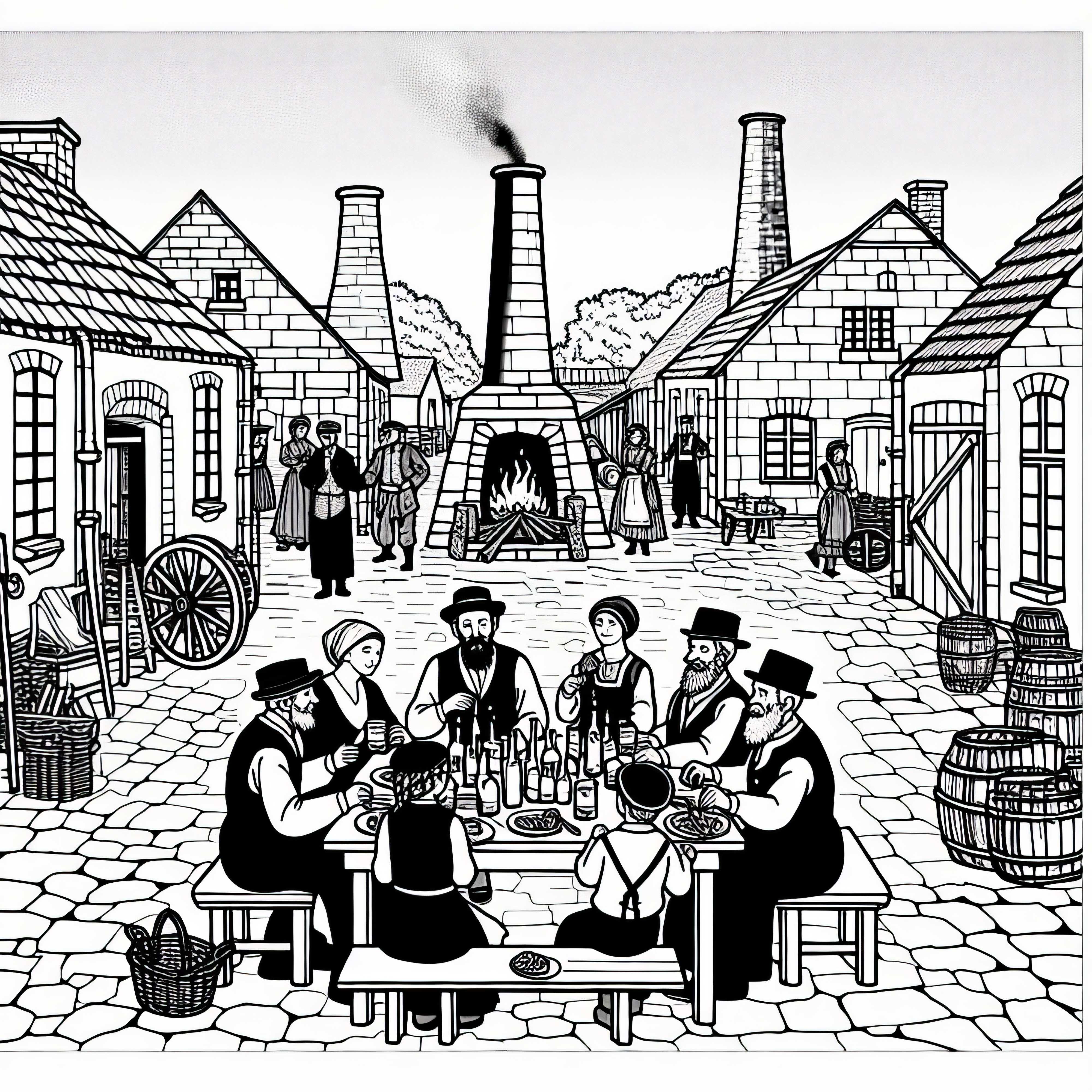 Familien spiser sammen i gårdsplassen til en arbeiderbolig. Fargeleggingsbilde Industriell revolusjon gratis