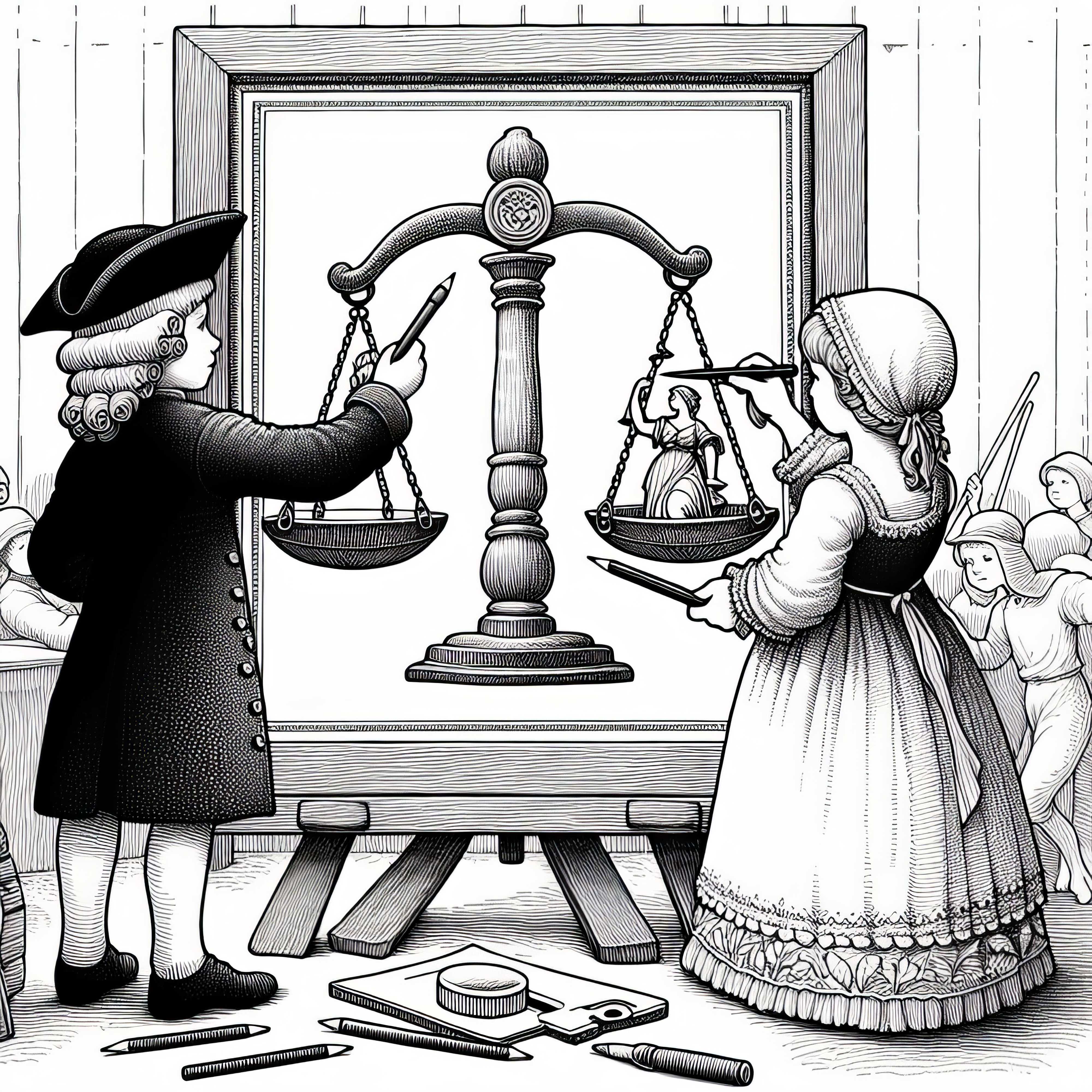 To barn maler et bilde av en vektskål som symbol for rettferdighet – fargeleggingsbilde fra den franske revolusjonen