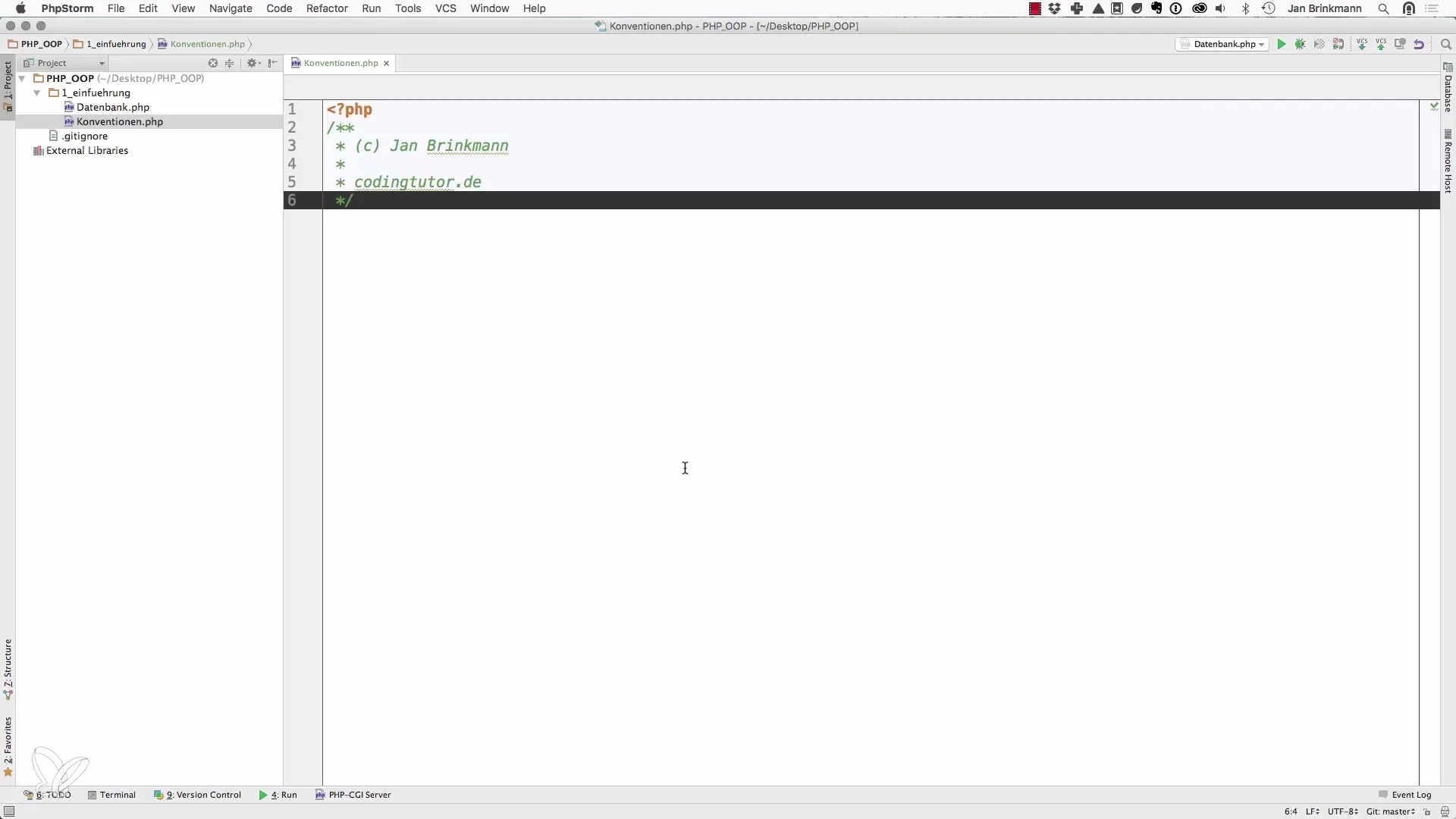 Det første punktet du bør merke deg er navngivningen av klassene. Klassennavnet skal alltid starte med stor bokstav. Dette gjør det lettere å skille mellom klasser og variabler. Når det gjelder filen, bør du sørge for at filnavnet gjenspeiler klassens navn, for eksempel Konvensjoner.php for en klasse Konvensjoner.