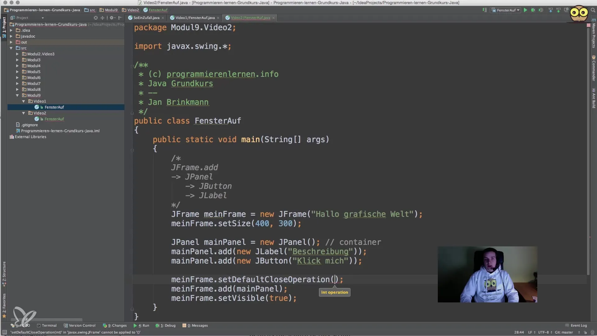 Et vanlig problem med bruk av JFrame er å lukke programmet korrekt. For å sikre at programmet virkelig avsluttes når GUI lukkes, må DefaultCloseOperation settes riktig. Her bruker vi JFrame.EXIT_ON_CLOSE for å lukke programmet fullstendig når vinduet lukkes.