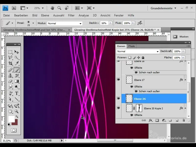 Legg nå til en glød utvendig for de større stripene. Velg "Layer" > "Layer Style" og sett dekningen til 70 % for å oppnå en subtil glødende effekt.