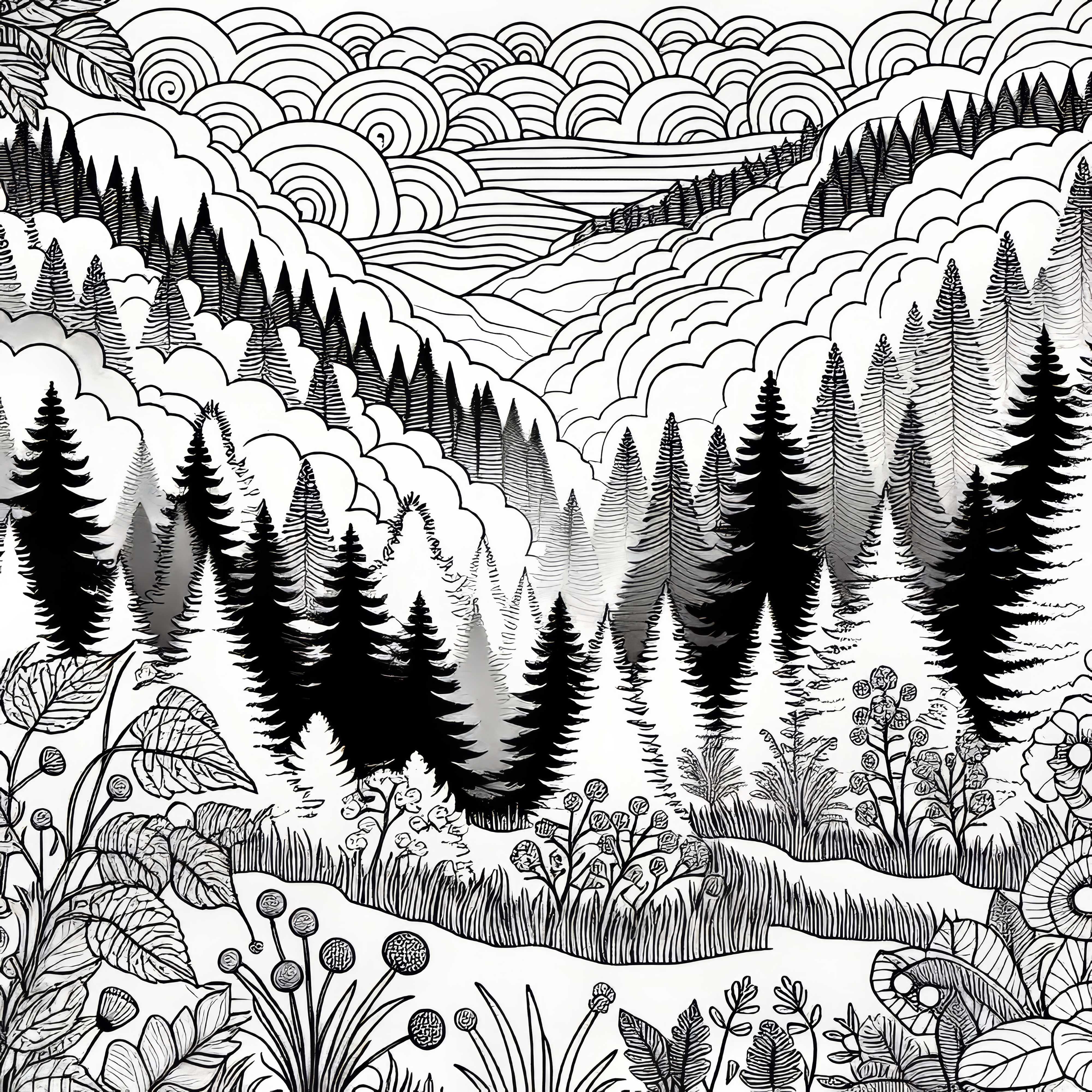 Las z drzewami iglastymi: darmowy obrazek do kolorowania