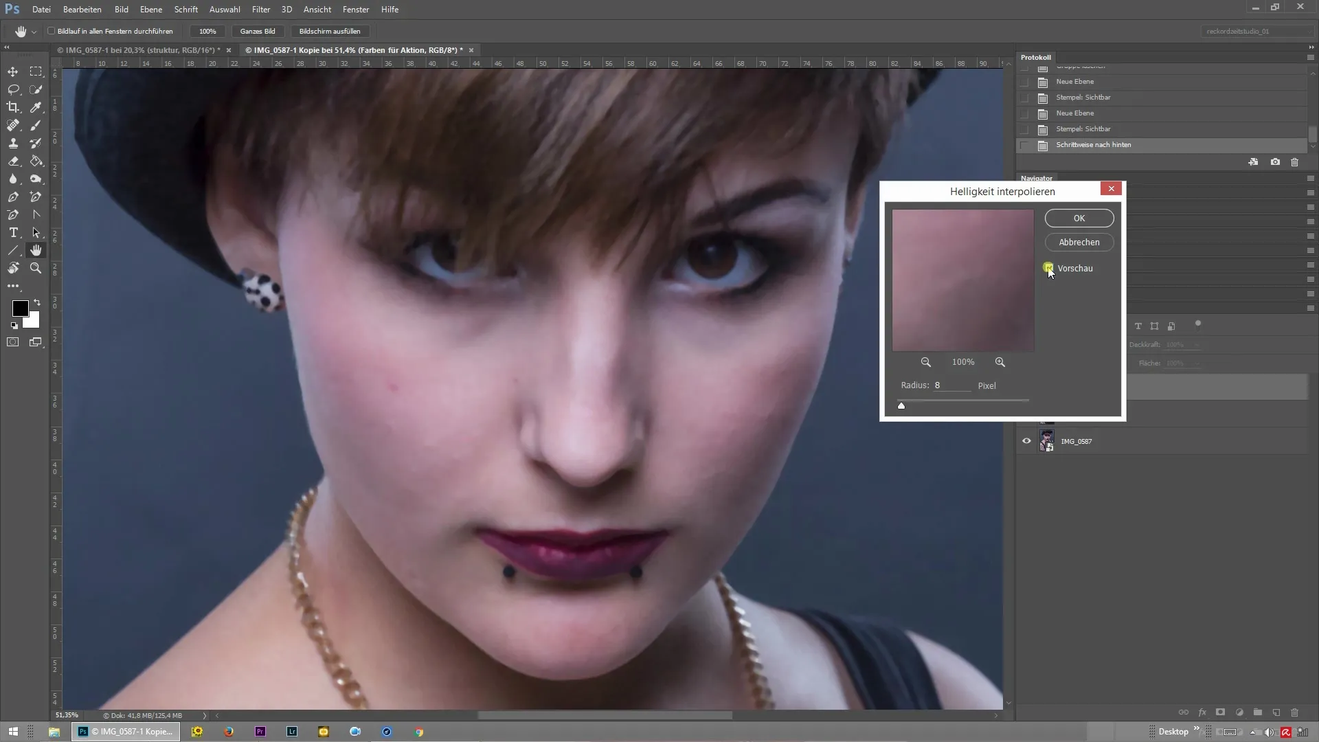 Teraz, gdy wykonałeś pierwsze kroki, dostosuj wartości w razie potrzeby. Eksperymentuj z niższymi lub wyższymi wartościami, aby zobaczyć, jak wpływają na teksturę i kolorystykę obrazu. Zwróć uwagę na to, jak małe włoski zachowują się na poziomie struktury i kolorów oraz czy są one wpływane przez retusz.